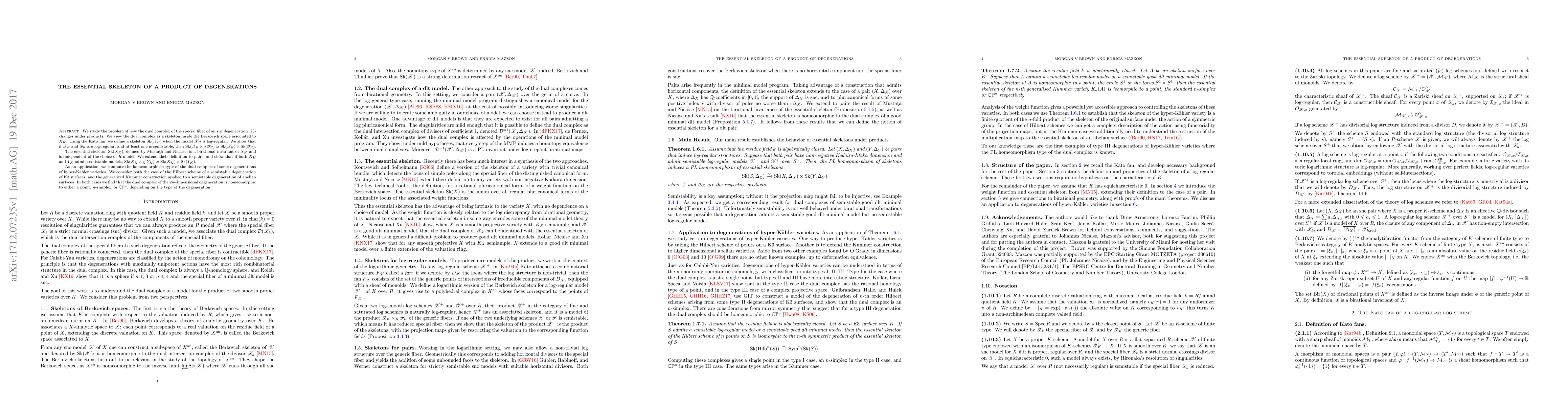 We study the problem of how the dual complex of the special fiber of an snc degeneration $\cX_R$ changes under products. We view the dual complex as a skeleton inside the Berkovich space associated to $X_K$. Using the Kato fan, we define a skeleton $\Sk(\cX_R)$ when the model $\cX_R$ is log-regular. We show that if $\cX_R$ and $\cY_R$ are log-regular, and at least one is semistable, then $\Sk(\cX_R\times_R \cY_R) \simeq \Sk(\cX_R)\times \Sk(\cY_R)$. The essential skeleton $\Sk(X_K)$, defined by Musta\c{t}\u{a} and Nicaise, is a birational invariant of $X_K$ and is independent of the choice of $R$-model. We extend their definition to pairs, and show that if both $X_K$ and $Y_K$ admit semistable models, $\Sk(X_K\times_K Y_K) \simeq \Sk(X_K)\times \Sk(Y_K)$. As an application, we compute the homeomorphism type of the dual complex of some degenerations of hyper-K{\"a}hler varieties. We consider both the case of the Hilbert scheme of a semistable degeneration of K3 surfaces, and the generalized Kummer construction applied to a semistable degeneration of abelian surfaces. In both cases we find that the dual complex of the $2n$-dimensional degeneration is homeomorphic to either a point, $n$-simplex, or $\mathbb{C}\mathbb{P}^n$, depending on the type of the degeneration.