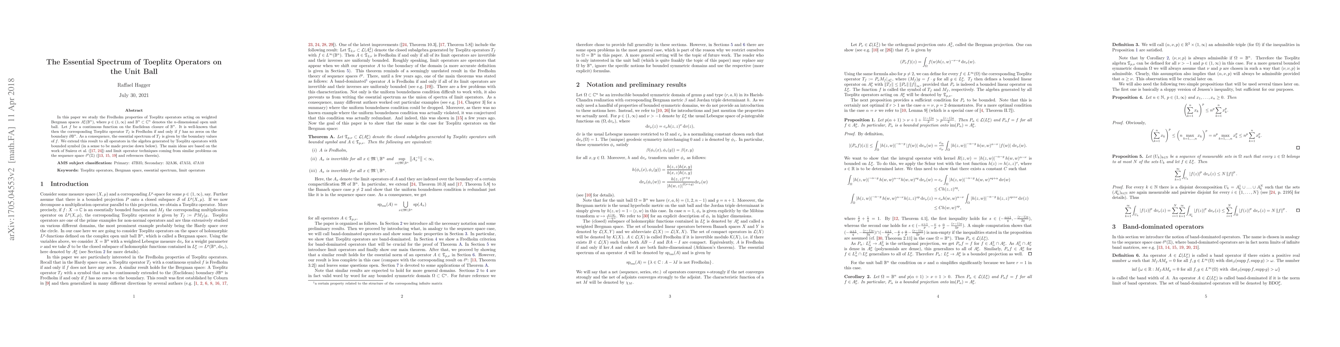 This paper explores the Fredholm properties of Toeplitz operators on weighted Bergman spaces within the unit ball, showing that the essential spectrum of these operators is determined by the boundary values of their continuous symbols. The study extends these results to operators within the algebra generated by Toeplitz operators with bounded symbols, utilizing techniques from Suarez et al. and limit operator methods.