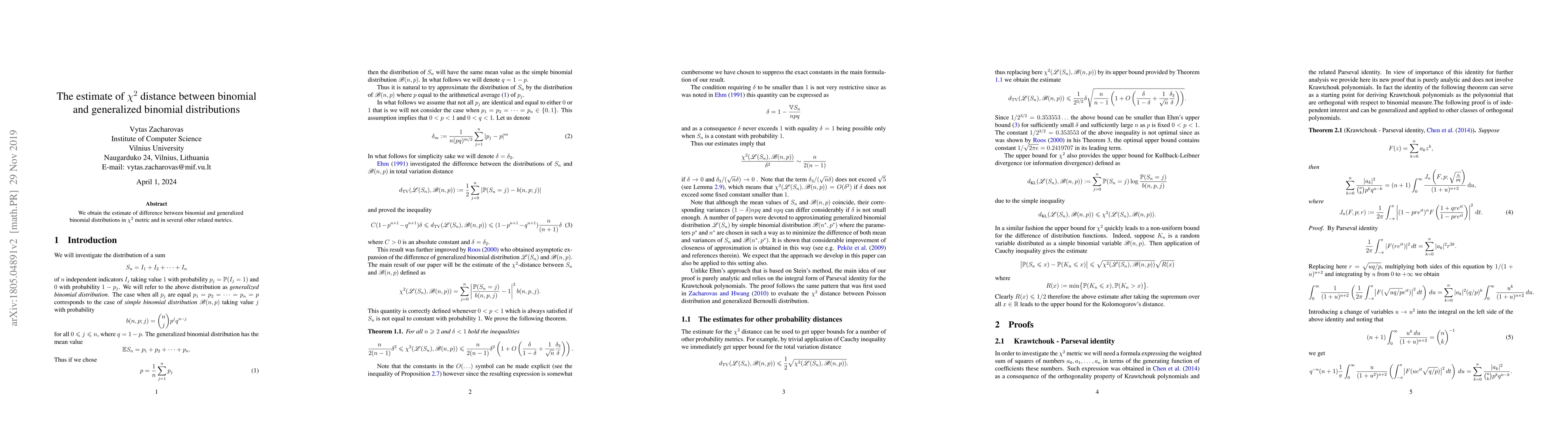 Summary: This paper estimates the $\chi^2$ distance between binomial and generalized binomial distributions, providing insights into their differences through $\chi^2$ and other related metrics.