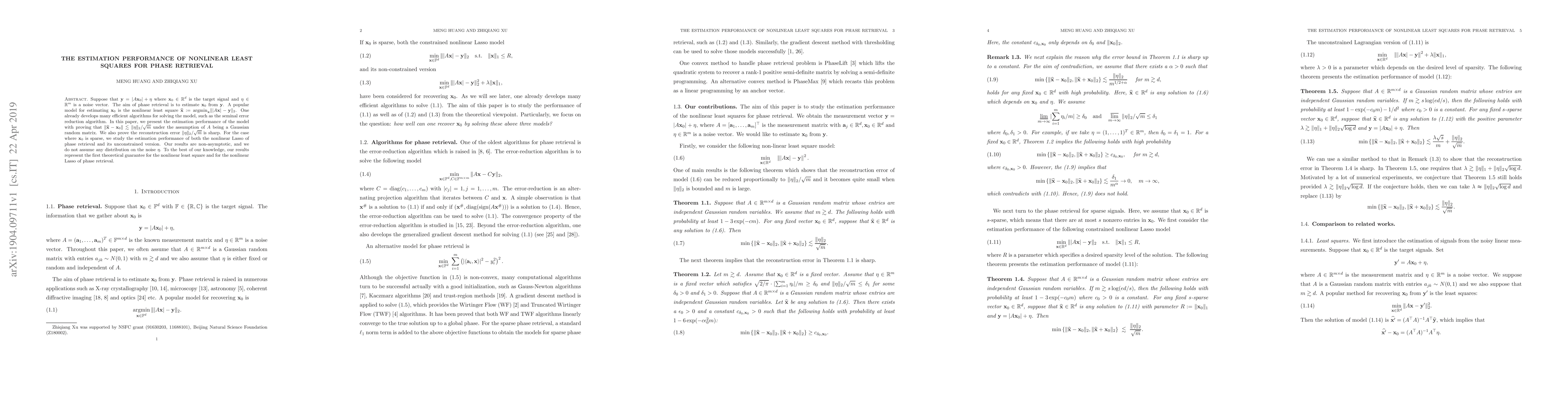 This paper studies the estimation performance of nonlinear least squares for phase retrieval, providing a theoretical guarantee that the reconstruction error is bounded by {\igloor \{\igloor \|\\eta\\\big floor_2}/{\igloor \sqrt{m} \\\bigr floor}} and proving it is sharp under certain assumptions.