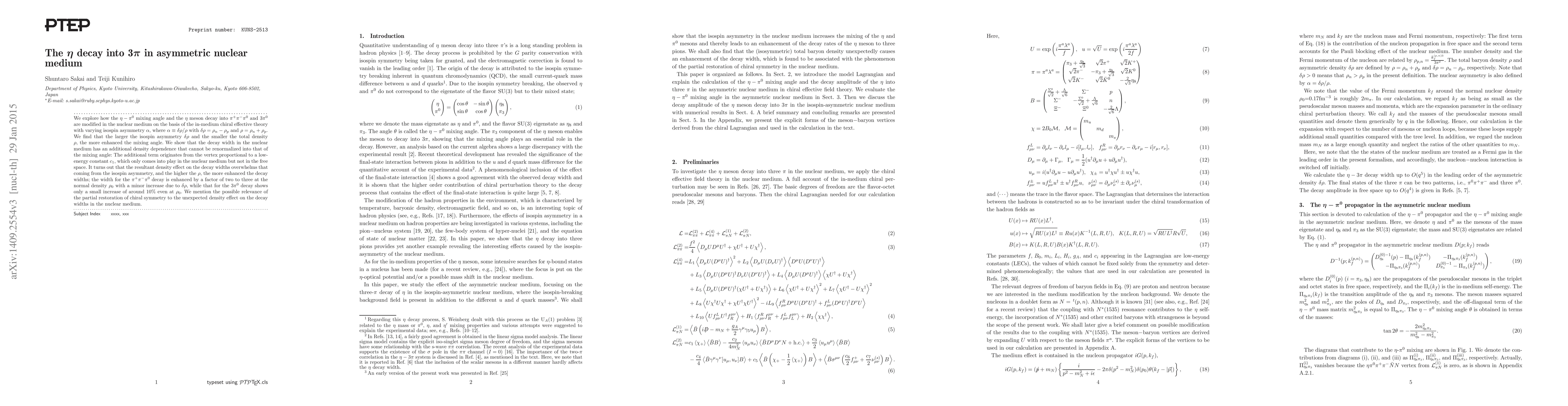 We explore how the $\eta$-$\pi^0$ mixing angle and the $\eta$ meson decay into $\pi^{+}\pi^{-}\pi^0$ and 3$\pi^{0}$ are modified in the nuclear medium on the basis of the in-medium chiral effective theory with the isospin asymmetry $\alpha$ varied, where $\alpha\equiv \delta\rho/\rho$ with $\delta \rho=\rho_n-\rho_p$ and $\rho=\rho_n+\rho_p$. We find that the larger the isospin asymmetry $\delta \rho$ and smaller the total density $\rho$, the more enhanced the mixing angle. We show that the decay width in the nuclear medium has an additional density dependence which cannot be renormalized into that of the mixing angle: The additional term originates from the vertex proportional to a low energy constant $c_1$, which only comes into play in the nuclear medium but not in the free space. It turns out that the resultant density effect on the decay widths overwhelms that coming from the isospin asymmetry, and the higher the $\rho$, the more enhanced the decay widths; the width for the $\pi^{+}\pi^{-}\pi^0$ decay is enhanced with a factor two to three at the normal density $\rho_0$ with a minor increase due to $\delta \rho$, while that for the 3$\pi^0$ decay shows only a small increase of around 10 percent even at $\rho_0$. We mention the possible relevance of the partial restoration of chiral symmetry to the unexpected density effect on the decay widths in the nuclear medium.