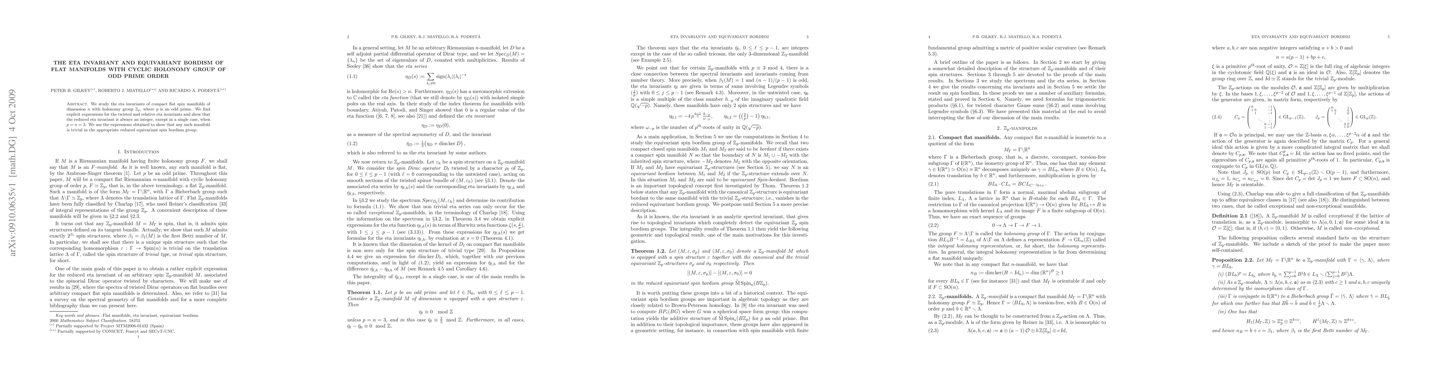This paper investigates eta invariants for compact flat spin manifolds with cyclic holonomy of odd prime order, deriving explicit expressions for twisted and relative eta invariants. It concludes that the reduced eta invariant is an integer except when the dimension is 3, and uses these findings to demonstrate that such manifolds are trivial in equivariant spin bordism groups.