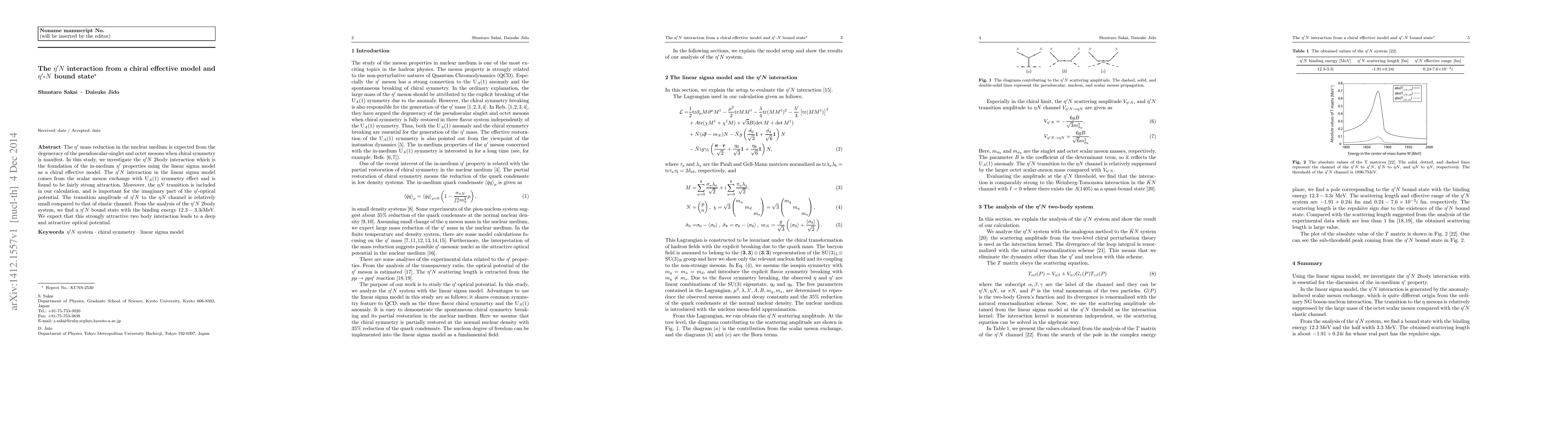 The $\eta'$ mass reduction in the nuclear medium is expected from the degeneracy of the pseudoscalar-singlet and octet mesons when chiral symmetry is manifest. In this study, we investigate the $\eta'N$ 2body interaction which is the foundation of the in-medium $\eta'$ properties using the linear sigma model as a chiral effective model. The $\eta'N$ interaction in the linear sigma model comes from the scalar meson exchange with U$_A$(1) symmetry effect and is found to be fairly strong attraction. Moreover, the $\eta N$ transition is included in our calculation, and is important for the imaginary part of the $\eta'$-optical potential. The transition amplitude of $\eta'N$ to the $\eta N$ channel is relatively small compared to that of elastic channel. From the analysis of the $\eta'N$ 2body system, we find a $\eta'N$ bound state with the binding energy $12.3-3.3i$MeV. We expect that this strongly attractive two body interaction leads to a deep and attractive optical potential.