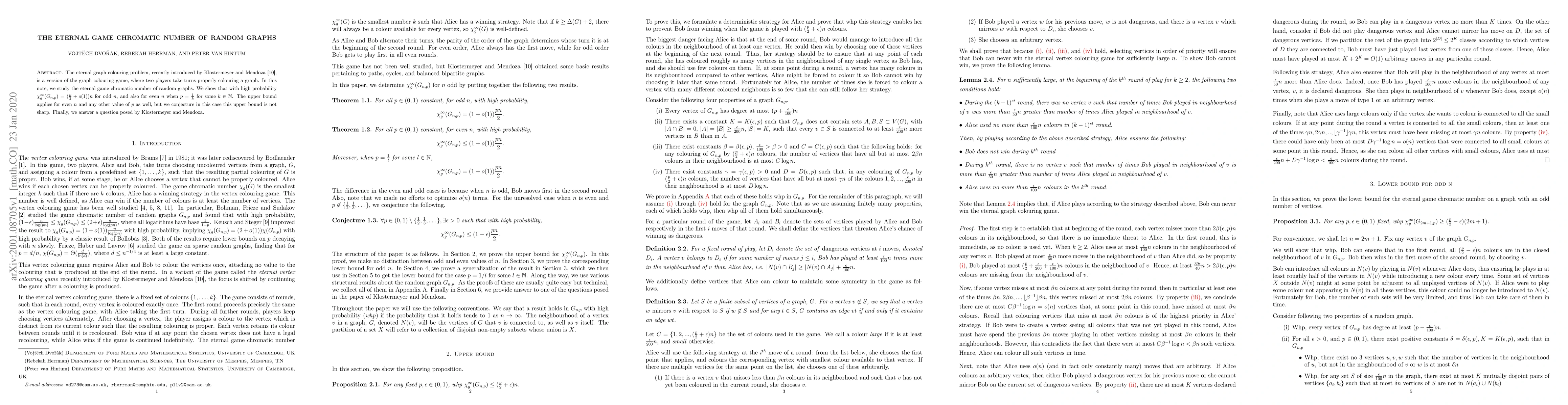 The paper presents a detailed analysis of the eternal game chromatic number for random graphs, establishing asymptotic bounds and addressing a specific case for even $n$ with $p = \frac{1}{k}$.