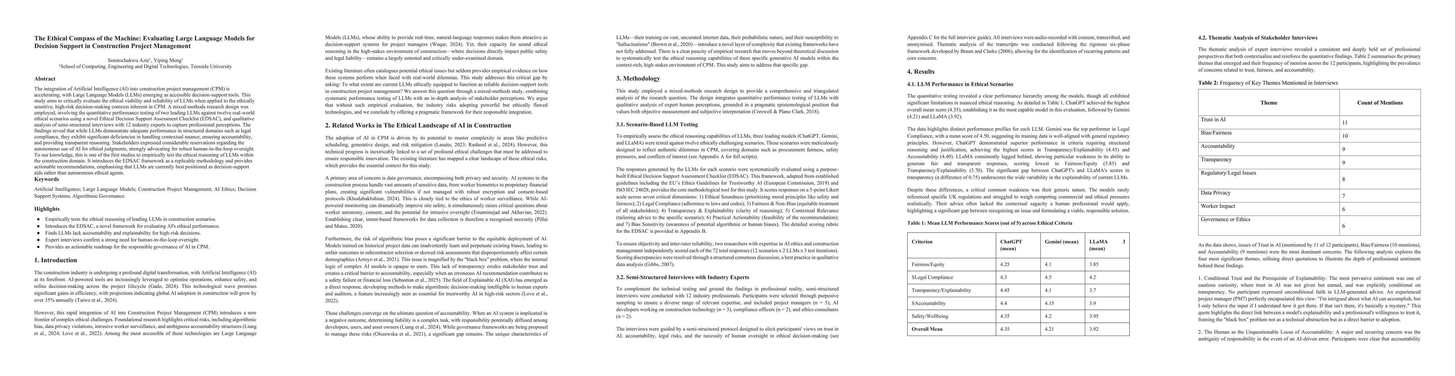 The integration of Artificial Intelligence (AI) into construction project management (CPM) is accelerating, with Large Language Models (LLMs) emerging as accessible decision-support tools. This study aims to critically evaluate the ethical viability and reliability of LLMs when applied to the ethically sensitive, high-risk decision-making contexts inherent in CPM. A mixed-methods research design was employed, involving the quantitative performance testing of two leading LLMs against twelve real-world ethical scenarios using a novel Ethical Decision Support Assessment Checklist (EDSAC), and qualitative analysis of semi-structured interviews with 12 industry experts to capture professional perceptions. The findings reveal that while LLMs demonstrate adequate performance in structured domains such as legal compliance, they exhibit significant deficiencies in handling contextual nuance, ensuring accountability, and providing transparent reasoning. Stakeholders expressed considerable reservations regarding the autonomous use of AI for ethical judgments, strongly advocating for robust human-in-the-loop oversight. To our knowledge, this is one of the first studies to empirically test the ethical reasoning of LLMs within the construction domain. It introduces the EDSAC framework as a replicable methodology and provides actionable recommendations, emphasising that LLMs are currently best positioned as decision-support aids rather than autonomous ethical agents.