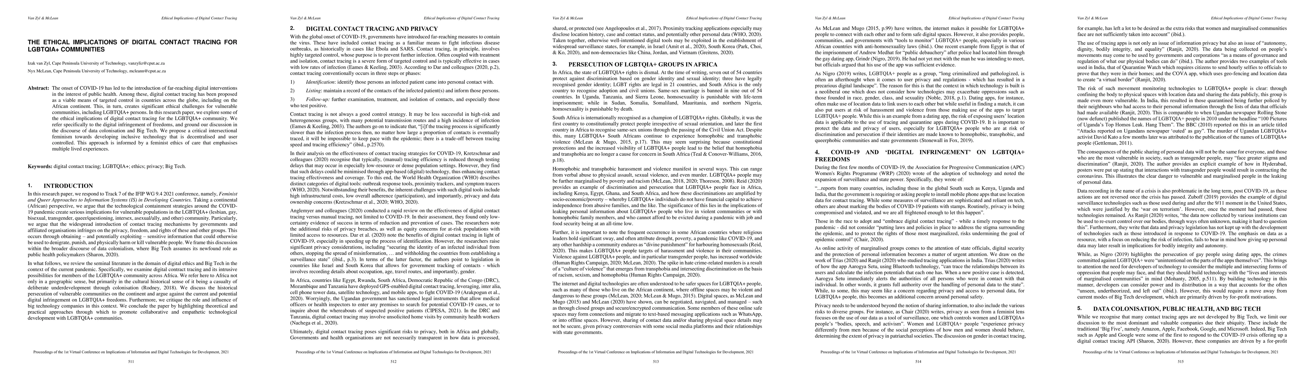 The onset of COVID-19 has led to the introduction of far-reaching digital interventions in the interest of public health. Among these, digital contact tracing has been proposed as a viable means of targeted control in countries across the globe, including on the African continent. This, in turn, creates significant ethical challenges for vulnerable communities, including LGBTQIA+ persons. In this research paper, we explore some of the ethical implications of digital contact tracing for the LGBTQIA+ community. We refer specifically to the digital infringement of freedoms, and ground our discussion in the discourse of data colonisation and Big Tech. We propose a critical intersectional feminism towards developing inclusive technology that is decentralised and user controlled. This approach is informed by a feminist ethics of care that emphasises multiple lived experiences.