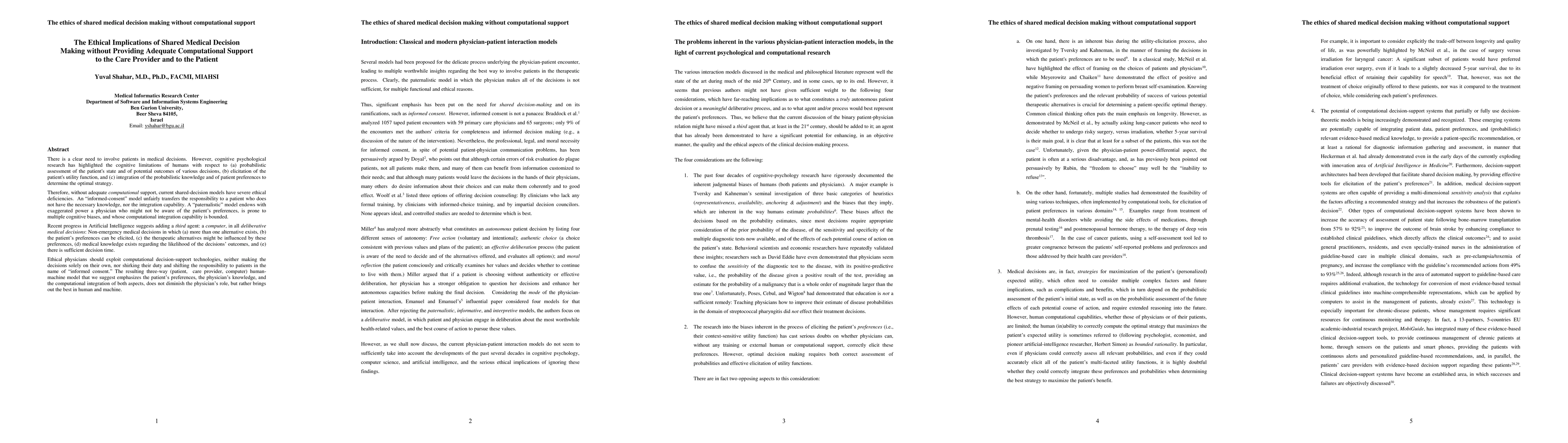 Shared medical decision making without adequate computational support can lead to ethical deficiencies due to human cognitive limitations. A new three-way model involving patients, care providers, and computers emphasizes patient preferences, physician knowledge, and computational integration for optimal decision-making.