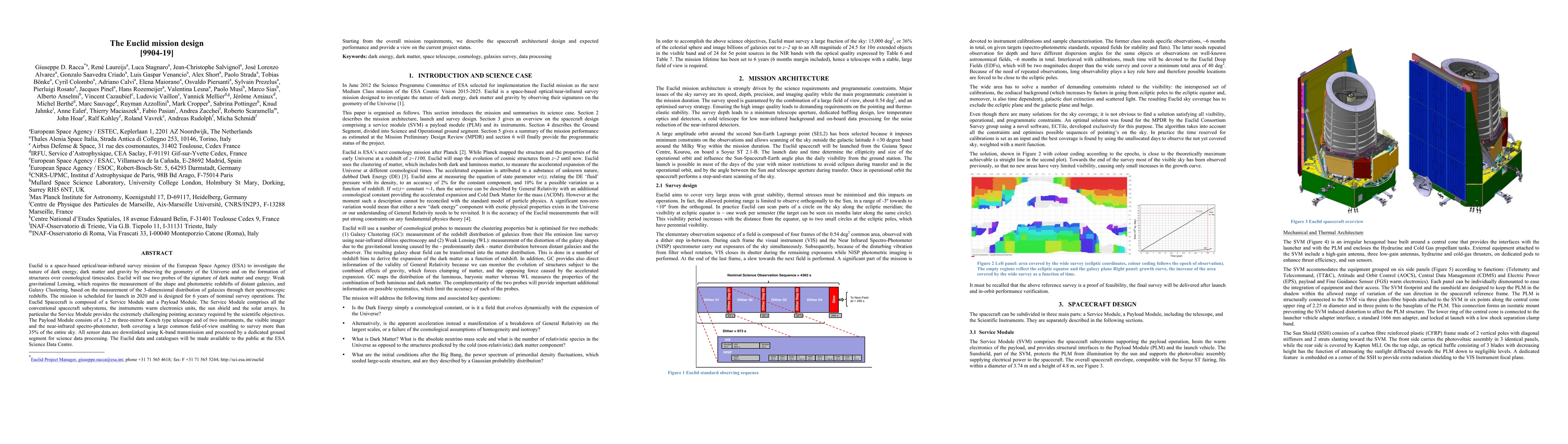 The Euclid mission, a space-based survey by ESA, aims to explore dark energy, dark matter, and gravity through weak gravitational lensing and galaxy clustering. Scheduled for launch in 2020, it features a 1.2 m telescope and two instruments to cover over 35% of the sky and will release data to the public.
