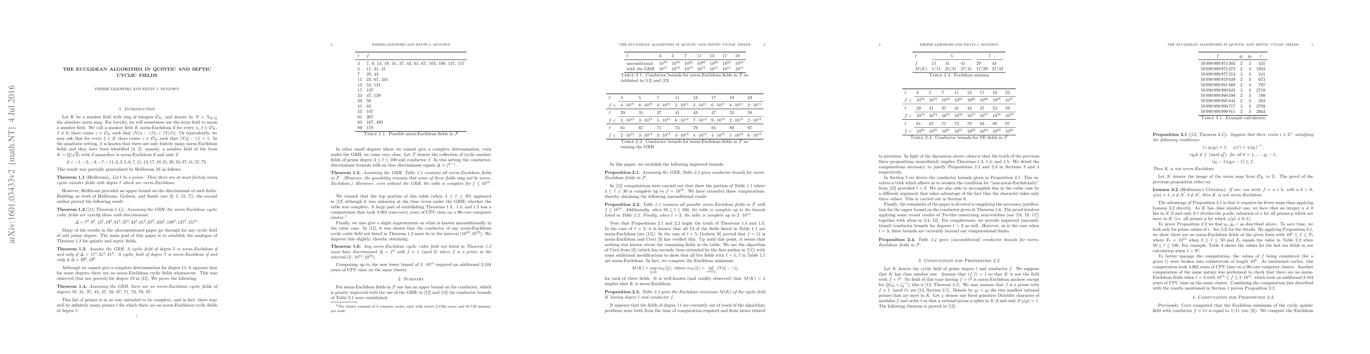 Conditionally on the Generalized Riemann Hypothesis (GRH), we prove the following results: (1) a cyclic number field of degree $5$ is norm-Euclidean if and only if $\Delta=11^4,31^4,41^4$; (2) a cyclic number field of degree $7$ is norm-Euclidean if and only if $\Delta=29^6,43^6$; (3) there are no norm-Euclidean cyclic number fields of degrees $19$, $31$, $37$, $43$, $47$, $59$, $67$, $71$, $73$, $79$, $97$. Our proofs contain a large computational component, including the calculation of the Euclidean minimum in some cases; the correctness of these calculations does not depend upon the GRH. Finally, we improve on what is known unconditionally in the cubic case by showing that any norm-Euclidean cyclic cubic field must have conductor $f\leq 157$ except possibly when $f\in(2\cdot 10^{14}, 10^{50})$.