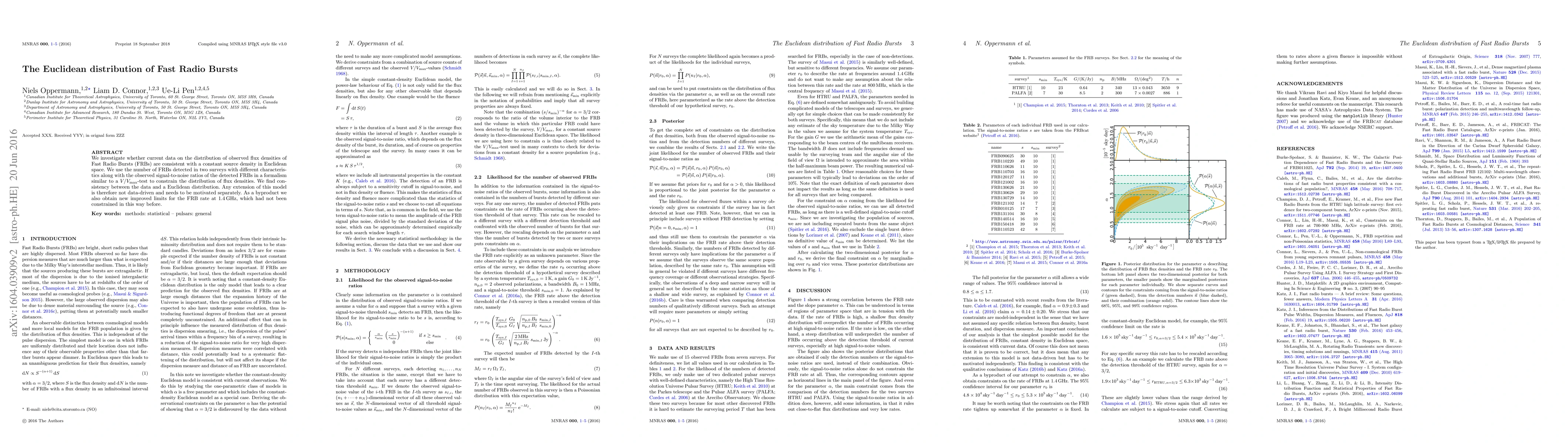 We investigate whether current data on the distribution of observed flux densities of Fast Radio Bursts (FRBs) are consistent with a constant source density in Euclidean space. We use the number of FRBs detected in two surveys with different characteristics along with the observed signal-to-noise ratios of the detected FRBs in a formalism similar to a V/V_max-test to constrain the distribution of flux densities. We find consistency between the data and a Euclidean distribution. Any extension of this model is therefore not data-driven and needs to be motivated separately. As a byproduct we also obtain new improved limits for the FRB rate at 1.4 GHz, which had not been constrained in this way before.