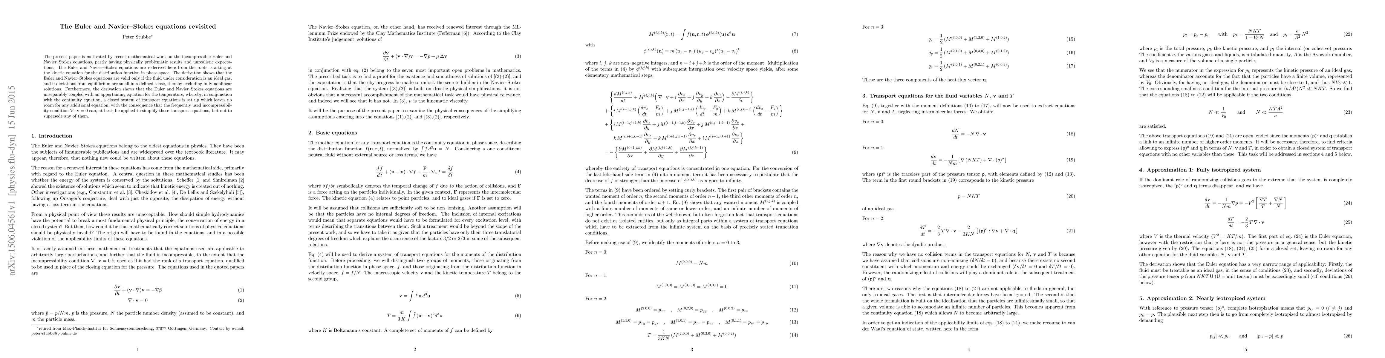 This paper revisits the derivation of the Euler and Navier-Stokes equations from kinetic theory, showing they apply only to ideal gases with small deviations from equilibrium, and establishes a closed system of transport equations that precludes the use of the incompressibility condition to replace any of them.