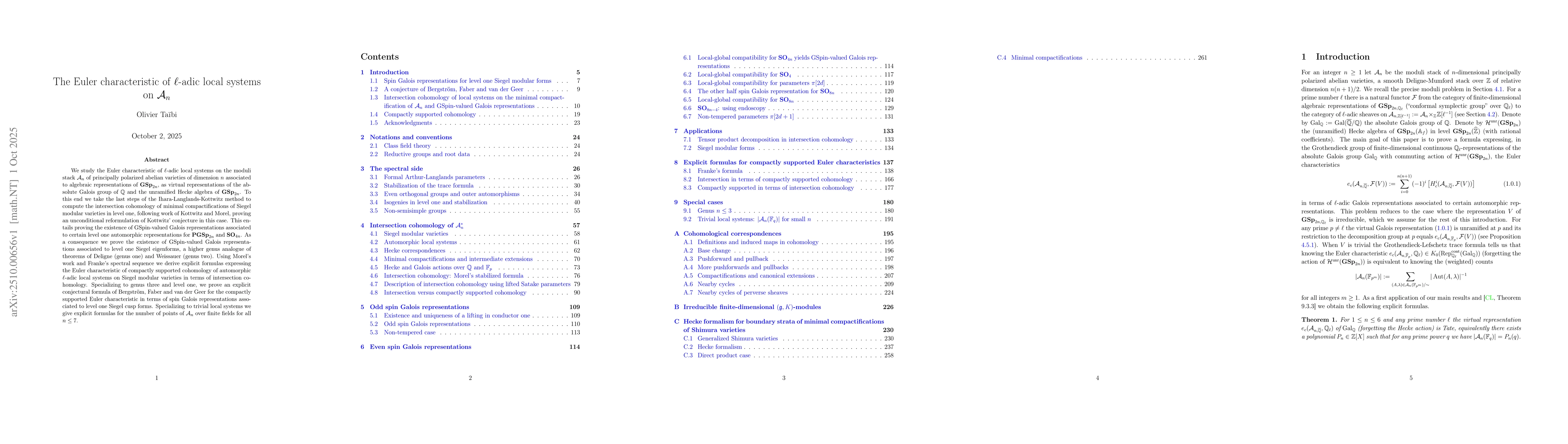 We study the Euler characteristic of $\ell$-adic local systems on the moduli stack $\mathcal{a}_n$ of principally polarized abelian varieties of dimension $n$ associated to algebraic representations of $\mathbf{GSp}_{2n}$, as virtual representations of the absolute Galois group of $\mathbb{Q}$ and the unramified Hecke algebra of $\mathbf{GSp}_{2n}$. To this end we take the last steps of the Ihara-Langlands-Kottwitz method to compute the intersection cohomology of minimal compactifications of Siegel modular varieties in level one, following work of Kottwitz and Morel, proving an unconditional reformulation of Kottwitz' conjecture in this case. This entails proving the existence of $\mathrm{GSpin}$-valued Galois representations associated to certain level one automorphic representations for $\mathbf{PGSp}_{2n}$ and $\mathbf{SO}_{4n}$. As a consequence we prove the existence of $\mathrm{GSpin}$-valued Galois representations associated to level one Siegel eigenforms, a higher genus analogue of theorems of Deligne (genus one) and Weissauer (genus two). Using Morel's work and Franke's spectral sequence we derive explicit formulas expressing the Euler characteristic of compactly supported cohomology of automorphic $\ell$-adic local systems on Siegel modular varieties in terms of intersection cohomology. Specializing to genus three and level one, we prove an explicit conjectural formula of Bergstr\"om, Faber and van der Geer for the compactly supported Euler characteristic in terms of spin Galois representations associated to level one Siegel cusp forms. Specializing to trivial local systems we give explicit formulas for the number of points of $\mathcal{A}_n$ over finite fields for all $n \leq 7$.