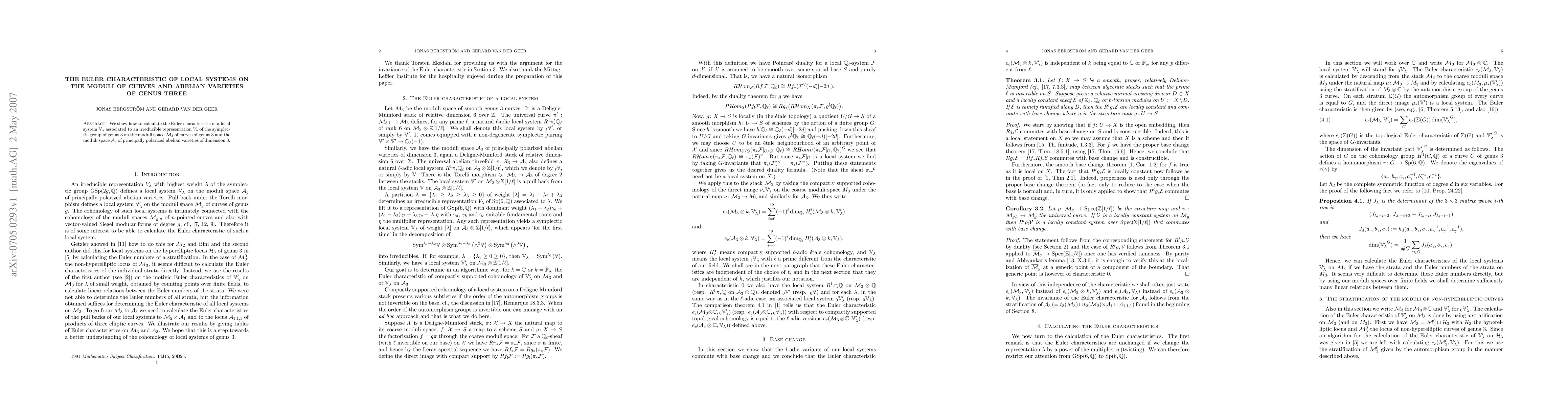Summary: This paper calculates the Euler characteristic of local systems linked to irreducible symplectic group representations on the moduli spaces of genus 3 curves and principally polarized abelian varieties. The results provide insights into the topological and algebraic structure of these moduli spaces.