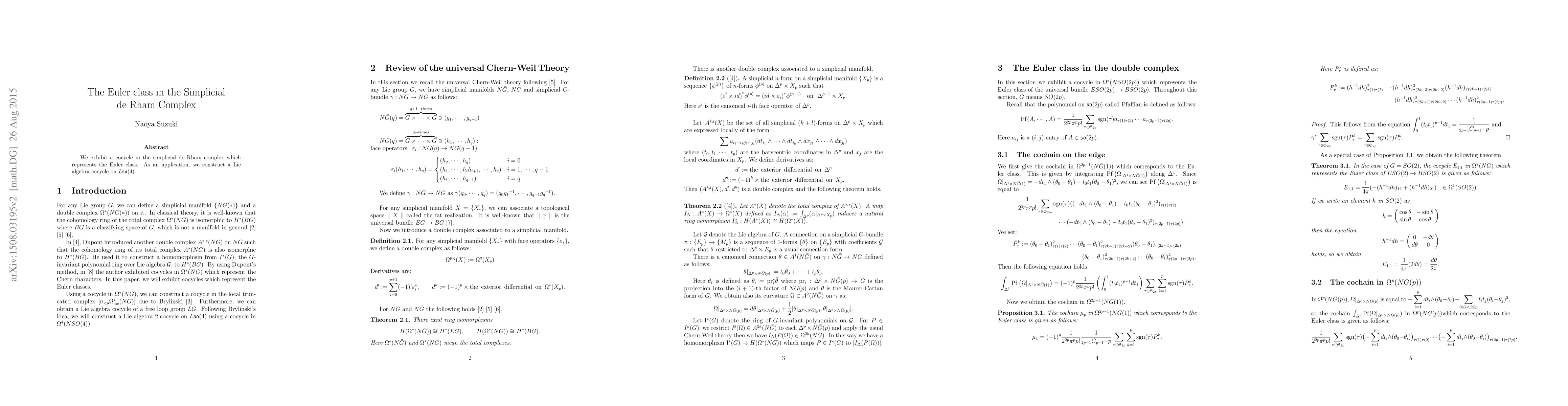 The paper constructs a cocycle in the simplicial de Rham complex representing the Euler class, and applies this to create a Lie algebra cocycle on $L\mathfrak{so}(4)$ by utilizing specific definitions and equations for Pkτ, E1,1, µp, and cocycles in Ωp+q(NG(p−q)).