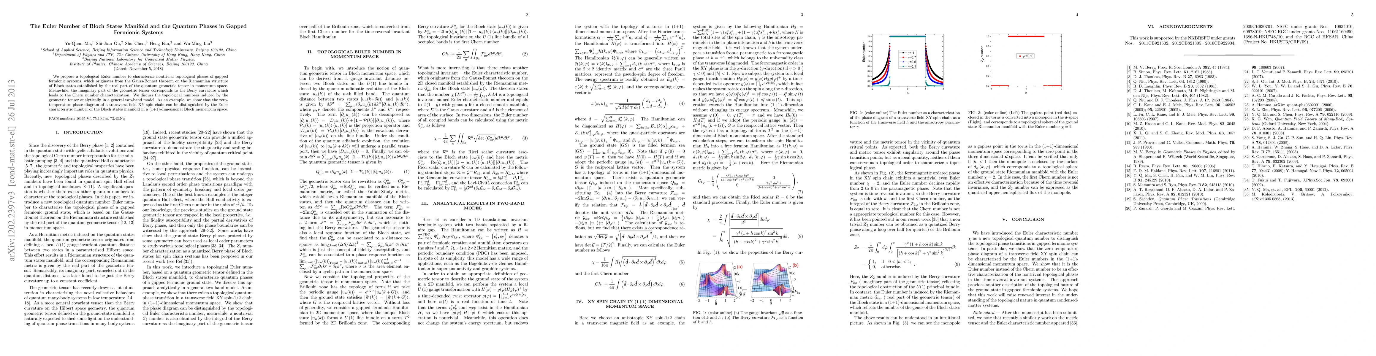 We propose a topological Euler number to characterize nontrivial topological phases of gapped fermionic systems, which originates from the Gauss-Bonnet theorem on the Riemannian structure of Bloch states established by the real part of the quantum geometric tensor in momentum space. Meanwhile, the imaginary part of the geometric tensor corresponds to the Berry curvature which leads to the Chern number characterization. We discuss the topological numbers induced by the geometric tensor analytically in a general two-band model. As an example, we show that the zero-temperature phase diagram of a transverse field XY spin chain can be distinguished by the Euler characteristic number of the Bloch states manifold in a (1+1)-dimensional Bloch momentum space.