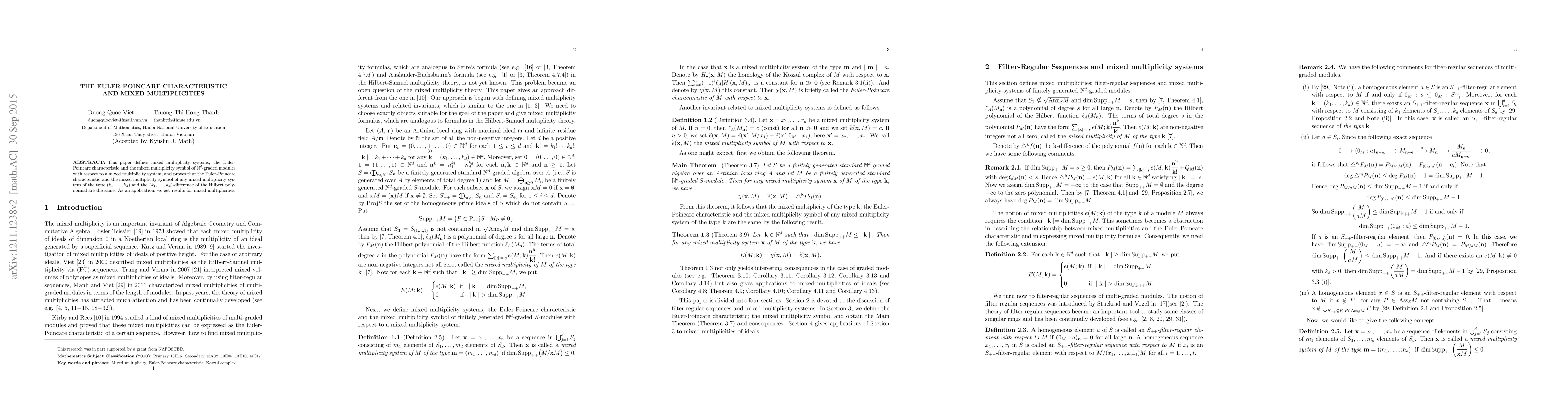 This paper defines mixed multiplicity systems; the Euler-Poincare characteristic and the mixed multiplicity symbol of $\mathbb{N}^d$-graded modules with respect to a mixed multiplicity system, and proves that the Euler-Poincare characteristic and the mixed multiplicity symbol of any mixed multiplicity system of the type $(k_1,\ldots,k_d)$ and the $(k_1,\ldots,k_d)$-difference of the Hilbert polynomial are the same. As an application, we get results for mixed multiplicities.