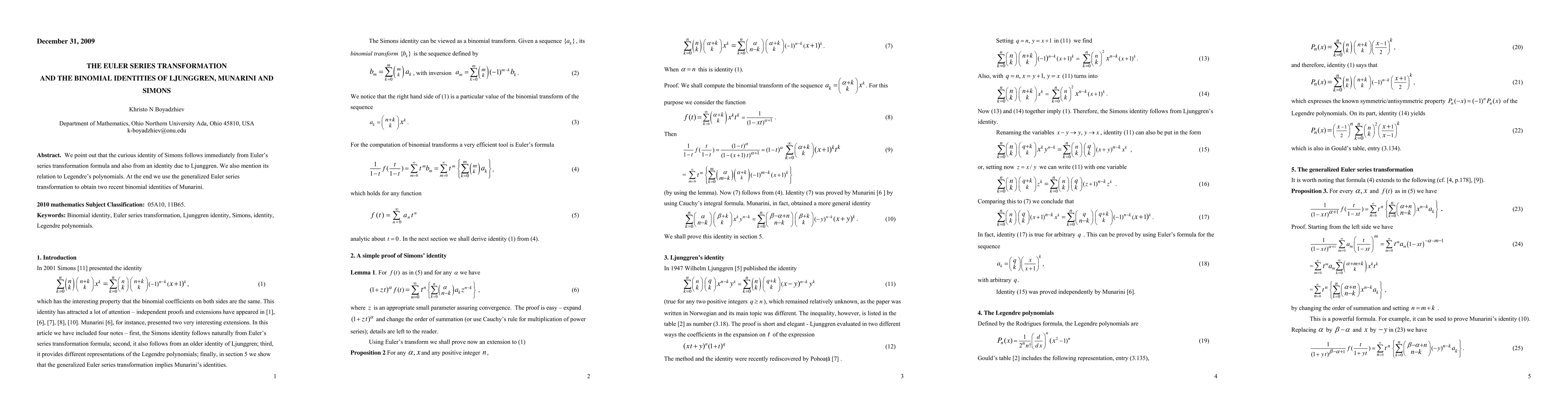 It is shown that the curious identity of Simons follows immediately from Euler's series transformation formula and also from an identity due to Ljunggren. The relation of Simons' identity to Legendre's polynomials is also discussed. At the end we use the generalized Euler series transformation to obtain two recent binomial identities of Munarini.