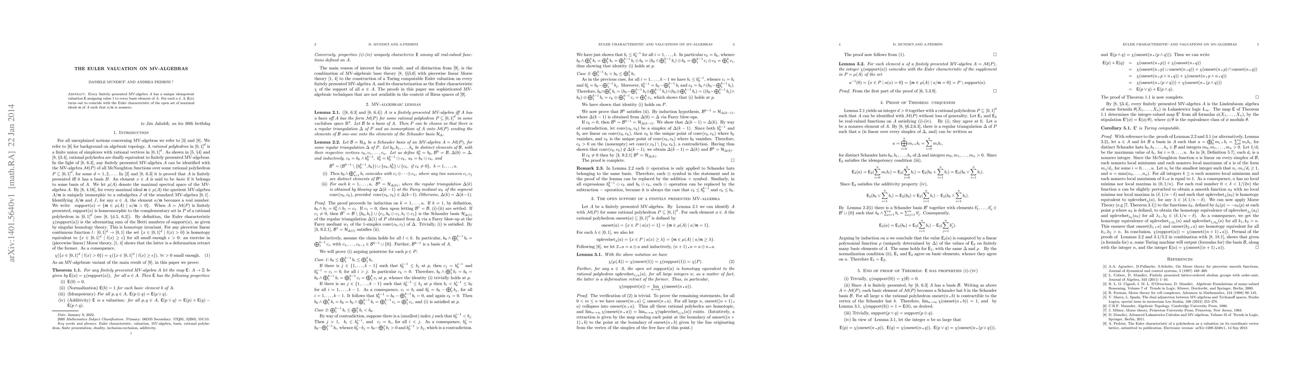 This paper introduces a unique idempotent valuation E for every finitely presented MV-algebra, assigning 1 to basic elements. E(a) corresponds to the Euler characteristic of maximal ideals m where a/m is nonzero, establishing a connection between MV-algebras and Euler characteristics.