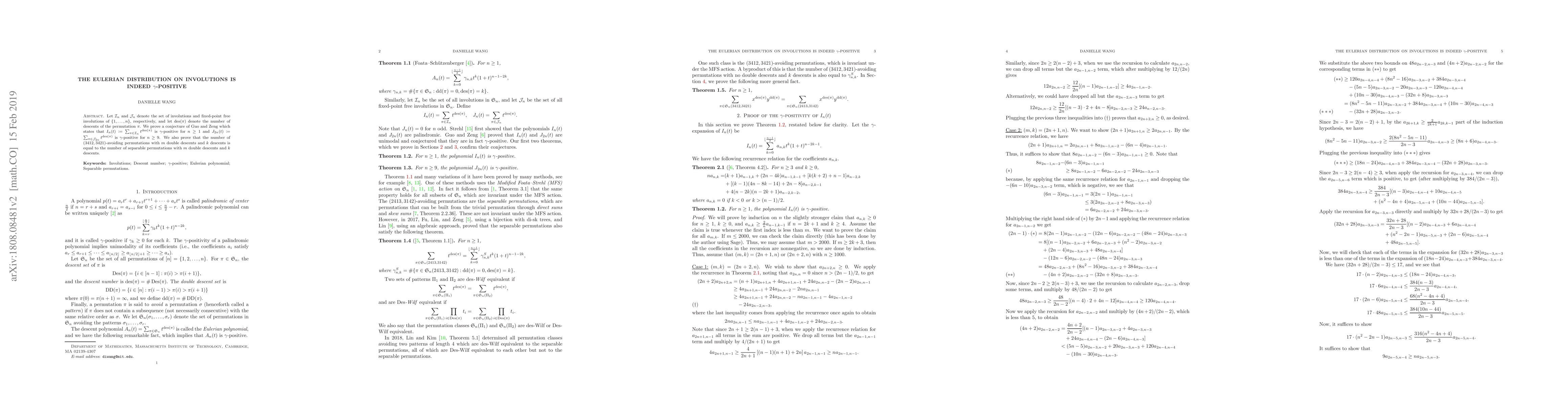 This paper proves a conjecture about the positivity of Eulerian distributions on involutions and fixed-point free involutions, establishing that $I_n(t)$ and $J_{2n}(t)$ are $gamma$-positive for specified $n$ values. It also equates the counts of certain permutation types, linking $(3412, 3421)$-avoiding permutations with separable permutations based on double and regular descents.
