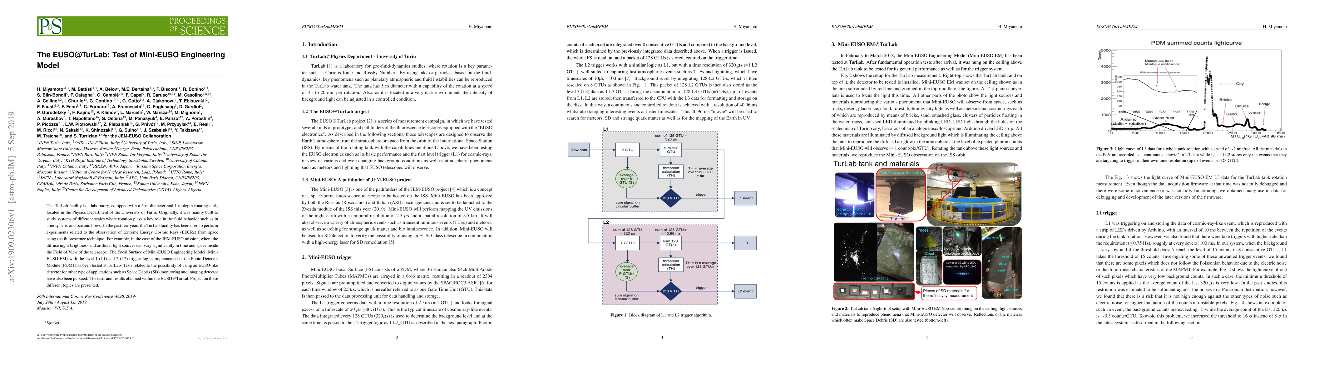 The TurLab facility is a laboratory, equipped with a 5 m diameter and 1 m depth rotating tank, located in the Physics Department of the University of Turin. Originally, it was mainly built to study systems of different scales where rotation plays a key role in the fluid behavior such as in atmospheric and oceanic flows. In the past few years the TurLab facility has been used to perform experiments related to the observation of Extreme Energy Cosmic Rays (EECRs) from space using the fluorescence technique. For example, in the case of the JEM-EUSO mission, where the diffuse night brightness and artificial light sources can vary significantly in time and space inside the Field of View of the telescope. The Focal Surface of Mini-EUSO Engineering Model (Mini-EUSO EM) with the level 1 (L1) and 2 (L2) trigger logics implemented in the Photo-Detector Module (PDM) has been tested at TurLab. Tests related to the possibility of using an EUSO-like detector for other type of applications such as Space Debris (SD) monitoring and imaging detector have also been pursued. The tests and results obtained within the EUSO@TurLab Project on these different topics are presented.