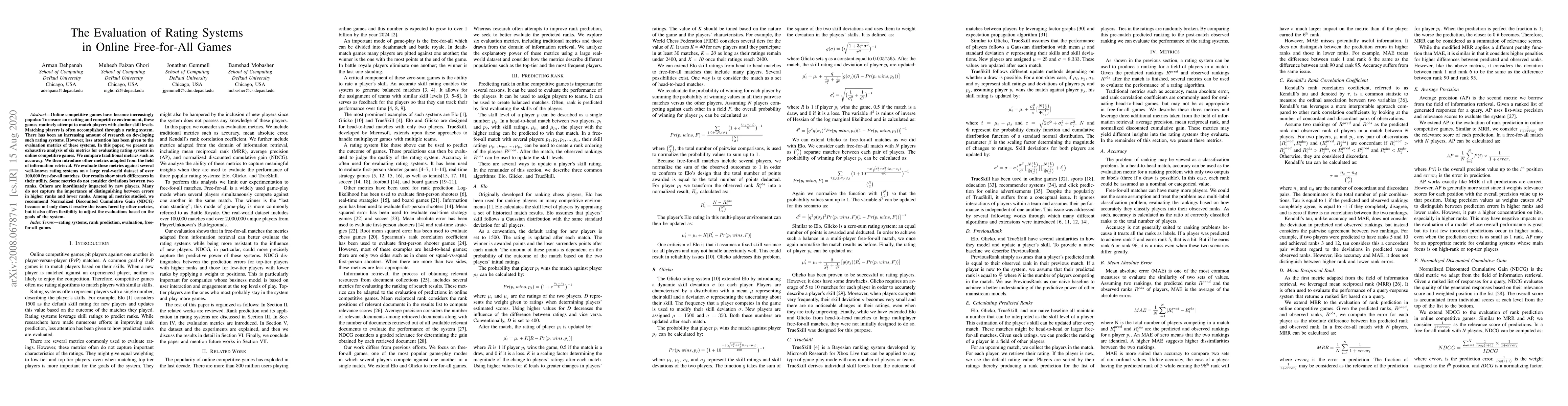 Online competitive games have become increasingly popular. To ensure an exciting and competitive environment, these games routinely attempt to match players with similar skill levels. Matching players is often accomplished through a rating system. There has been an increasing amount of research on developing such rating systems. However, less attention has been given to the evaluation metrics of these systems. In this paper, we present an exhaustive analysis of six metrics for evaluating rating systems in online competitive games. We compare traditional metrics such as accuracy. We then introduce other metrics adapted from the field of information retrieval. We evaluate these metrics against several well-known rating systems on a large real-world dataset of over 100,000 free-for-all matches. Our results show stark differences in their utility. Some metrics do not consider deviations between two ranks. Others are inordinately impacted by new players. Many do not capture the importance of distinguishing between errors in higher ranks and lower ranks. Among all metrics studied, we recommend Normalized Discounted Cumulative Gain (NDCG) because not only does it resolve the issues faced by other metrics, but it also offers flexibility to adjust the evaluations based on the goals of the system