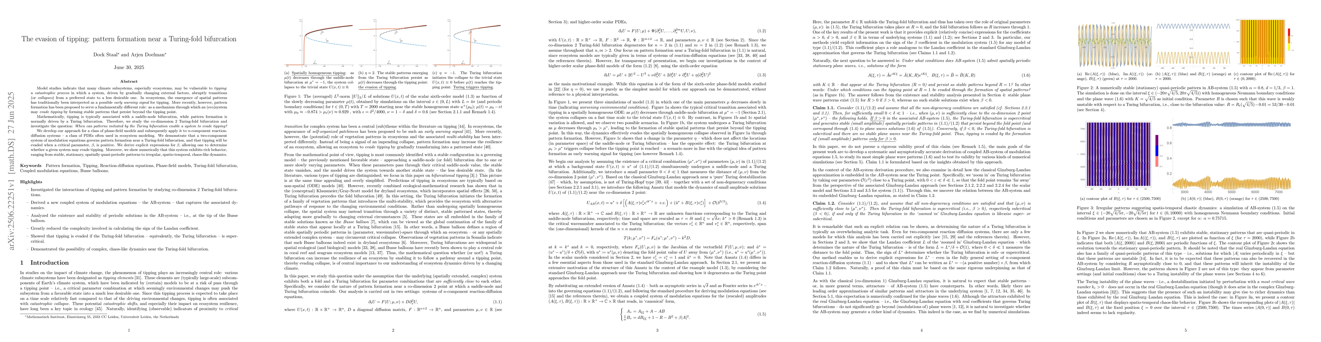 Model studies indicate that many climate subsystems, especially ecosystems, may be vulnerable to 'tipping': a 'catastrophic process' in which a system, driven by gradually changing external factors, abruptly transitions (or 'collapses') from a preferred state to a less desirable one. In ecosystems, the emergence of spatial patterns has traditionally been interpreted as a possible 'early warning signal' for tipping. More recently, however, pattern formation has been proposed to serve a fundamentally different role: as a mechanism through which an (eco)system may 'evade tipping' by forming stable patterns that persist beyond the tipping point. Mathematically, tipping is typically associated with a saddle-node bifurcation, while pattern formation is normally driven by a Turing bifurcation. Therefore, we study the co-dimension 2 Turing-fold bifurcation and investigate the question: 'When can patterns initiated by the Turing bifurcation enable a system to evade tipping?' We develop our approach for a class of phase-field models and subsequently apply it to $n$-component reaction-diffusion systems -- a class of PDEs often used in ecosystem modeling. We demonstrate that a two-component system of modulation equations governs pattern formation near a Turing-fold bifurcation, and that tipping will be evaded when a critical parameter, $\beta$, is positive. We derive explicit expressions for $\beta$, allowing one to determine whether a given system may evade tipping. Moreover, we show numerically that this system exhibits rich behavior, ranging from stable, stationary, spatially quasi-periodic patterns to irregular, spatio-temporal, chaos-like dynamics.