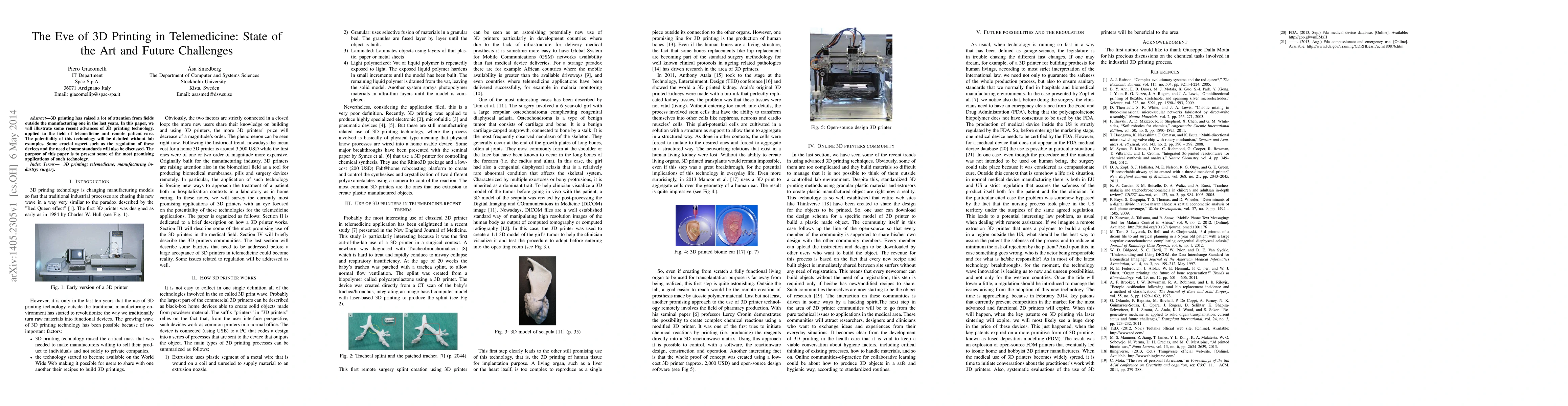 3D printing has raised a lot of attention from fields outside the manufacturing one in the last years. In this paper, we will illustrate some recent advances of 3D printing technology, applied to the field of telemedicine and remote patient care. The potentiality of this technology will be detailed without lab examples. Some crucial aspect such as the regulation of these devices and the need of some standards will also be discussed. The purpose of this paper is to present some of the most promising applications of such technology.