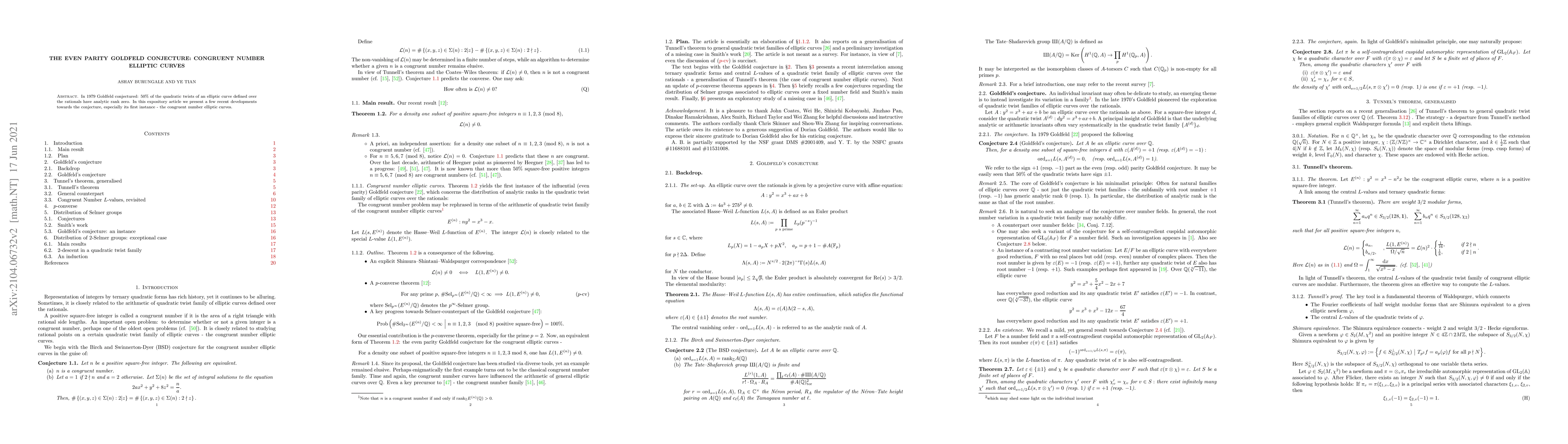 In 1979 Goldfeld conjectured: 50\% of the quadratic twists of an elliptic curve defined over the rationals have analytic rank zero. In this expository article we present a few recent developments towards the conjecture, especially its first instance - the congruent number elliptic curves.