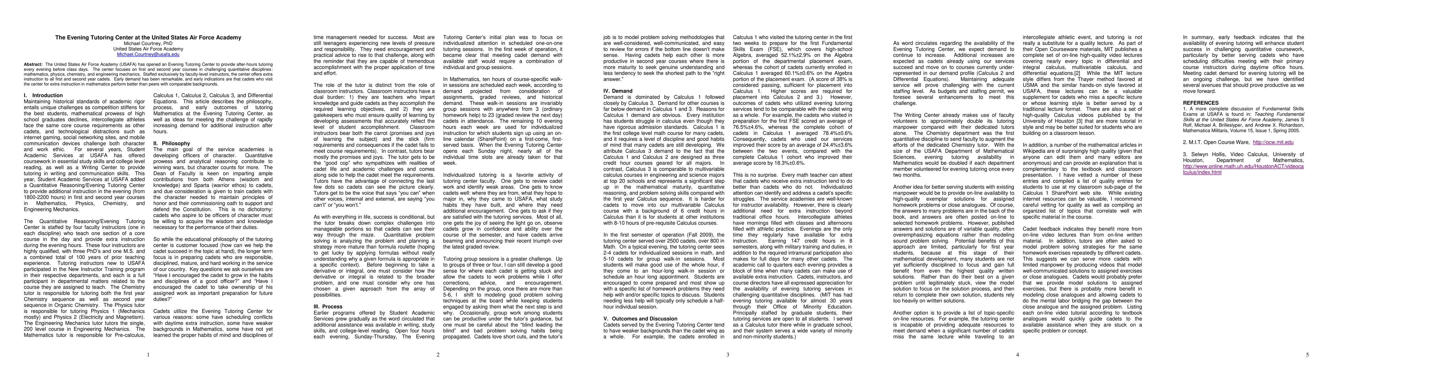 The United States Air Force Academy (USAFA) has opened an Evening Tutoring Center to provide after-hours tutoring every evening before class days. The center focuses on first and second year courses in challenging quantitative disciplines: mathematics, physics, chemistry, and engineering mechanics. Staffed exclusively by faculty-level instructors, the center offers extra instruction to all first and second year cadets. Early demand has been remarkable, and early indications are that cadets who visit the center for extra instruction in mathematics perform better than peers with comparable backgrounds.