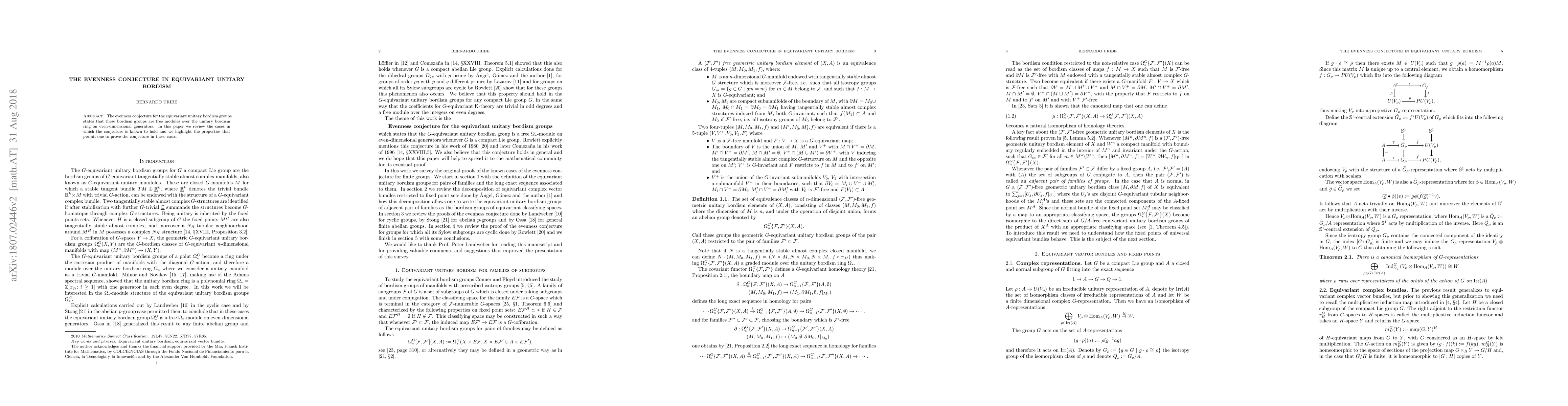 The evenness conjecture for the equivariant unitary bordism groups states that these bordism groups are free modules over the unitary bordism ring on even-dimensional generators. In this paper we review the cases in which the conjecture is known to hold and we highlight the properties that permit one to prove the conjecture in these cases.
