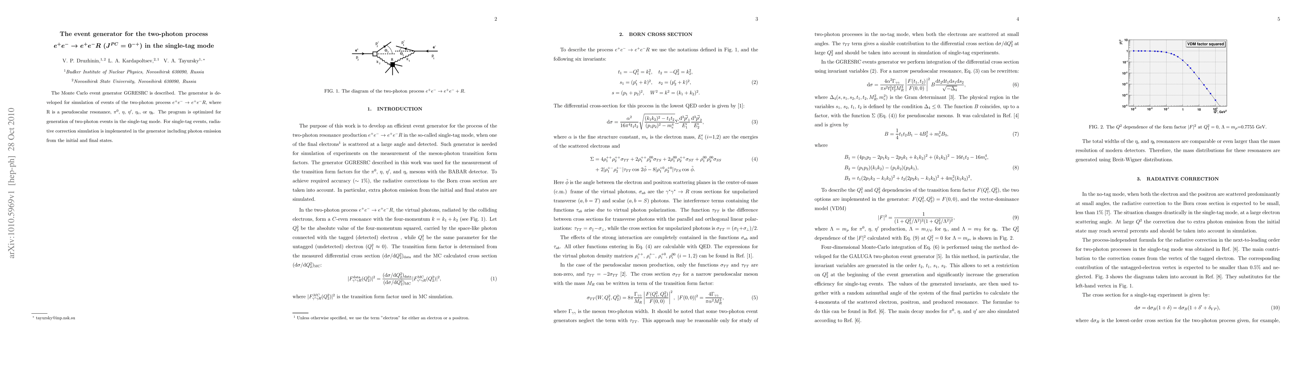 The Monte Carlo event generator GGRESRC is described. The generator is developed for simulation of events of the two-photon process e^+e^- --> e^+e^- R, where R is a pseudoscalar resonance, \pi^0, \eta, \eta', \eta_c, or \eta_b. The program is optimized for generation of two-photon events in the single-tag mode. For single-tag events, radiative correction simulation is implemented in the generator including photon emission from the initial and final states.