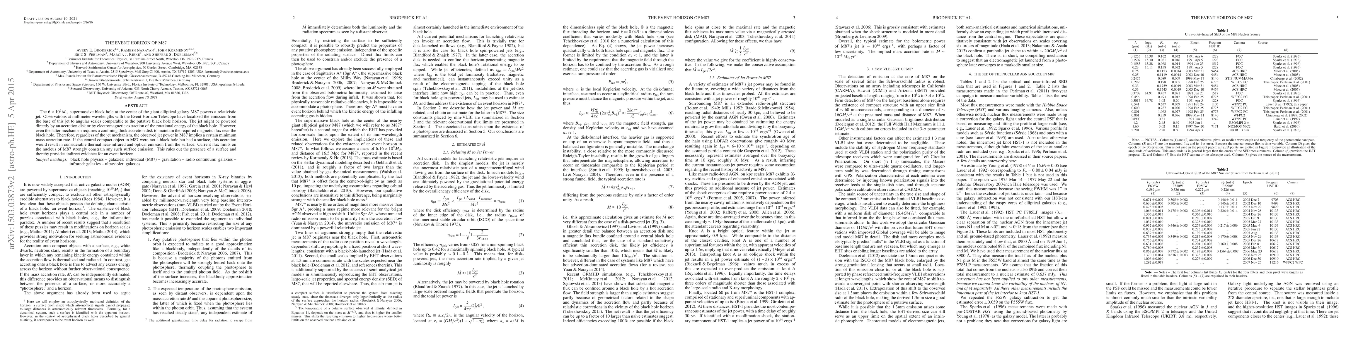 The Event Horizon Telescope has localized emission from the base of M87's relativistic jet, suggesting it is powered by the black hole's accretion disk or rotational energy. The absence of thermal emission from the nucleus rules out a surface, providing indirect evidence for an event horizon.