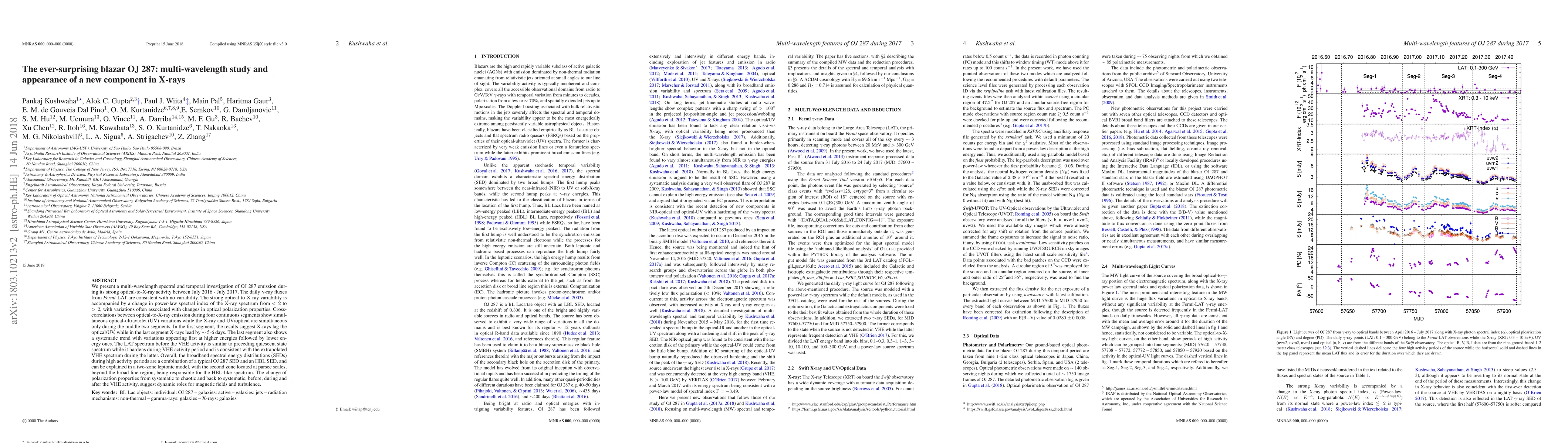 We present a multi-wavelength spectral and temporal investigation of OJ 287 emission during its strong optical-to-X-ray activity between July 2016 - July 2017. The daily $\gamma$-ray fluxes from \emph{Fermi}-LAT are consistent with no variability. The strong optical-to-X-ray variability is accompanied by a change in power-law spectral index of the X-ray spectrum from $< 2$ to $>2$, with variations often associated with changes in optical polarization properties. Cross-correlations between optical-to-X-ray emission during four continuous segments show simultaneous optical-ultraviolet (UV) variations while the X-ray and UV/optical are simultaneous only during the middle two segments. In the first segment, the results suggest X-rays lag the optical/UV, while in the last segment X-rays lead by $\sim$ 5-6 days. The last segment also shows a systematic trend with variations appearing first at higher energies followed by lower energy ones. The LAT spectrum before the VHE activity is similar to preceding quiescent state spectrum while it hardens during VHE activity period and is consistent with the extrapolated VHE spectrum during the latter. Overall, the broadband spectral energy distributions (SEDs) during high activity periods are a combination of a typical OJ 287 SED and an HBL SED, and can be explained in a two-zone leptonic model, with the second zone located at parsec scales, beyond the broad line region, being responsible for the HBL-like spectrum. The change of polarization properties from systematic to chaotic and back to systematic, before, during and after the VHE activity, suggest dynamic roles for magnetic fields and turbulence.