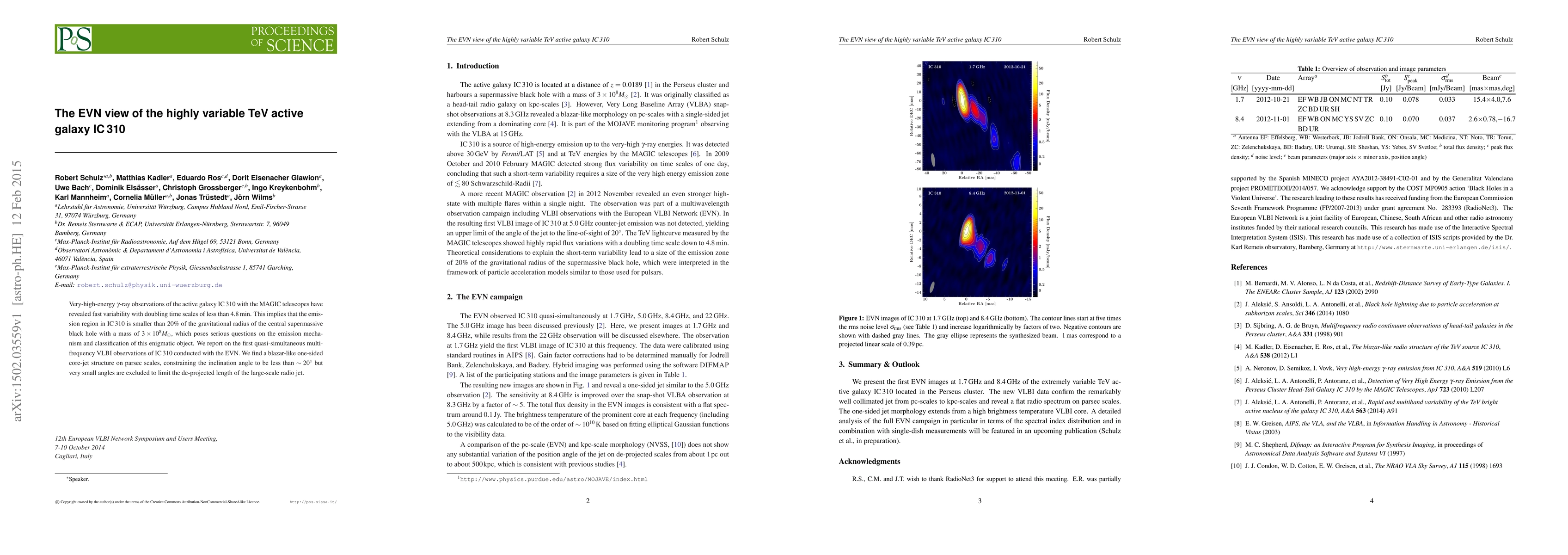 Very-high-energy $\gamma$-ray observations of the active galaxy IC 310 with the MAGIC telescopes have revealed fast variability with doubling time scales of less than 4.8min. This implies that the emission region in IC 310 is smaller than 20% of the gravitational radius of the central supermassive black hole with a mass of $3\times 10^8 M_\odot$, which poses serious questions on the emission mechanism and classification of this enigmatic object. We report on the first quasi-simultaneous multi-frequency VLBI observations of IC 310 conducted with the EVN. We find a blazar-like one-sided core-jet structure on parsec scales, constraining the inclination angle to be less than $\sim 20^\circ$ but very small angles are excluded to limit the de-projected length of the large-scale radio jet.