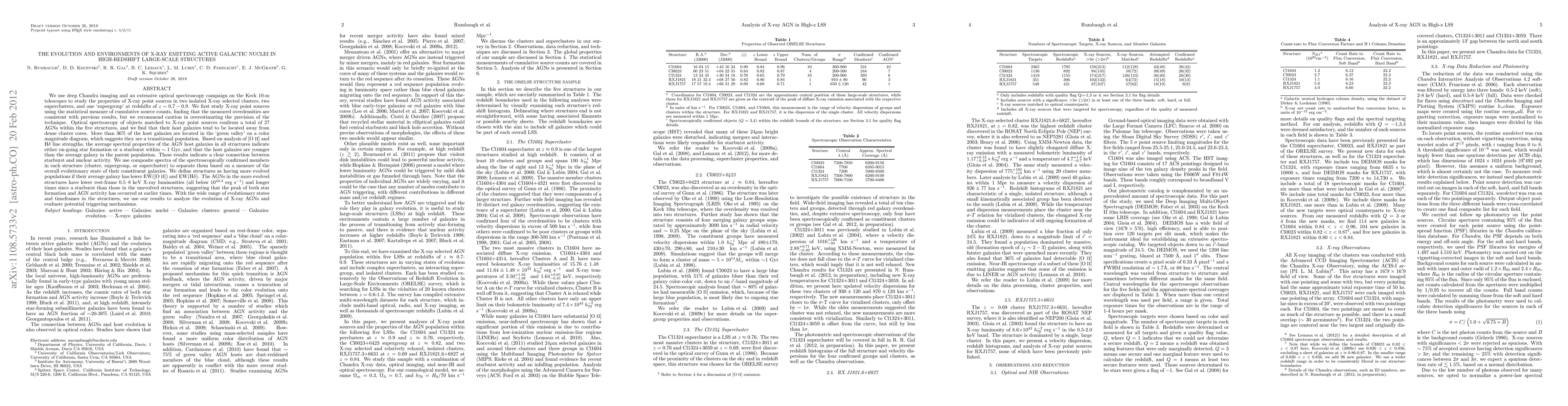 We use deep Chandra imaging and an extensive optical spectroscopy campaign on the Keck 10-m telescopes to study the properties of X-ray point sources in five large-scale structures at redshifts of z ~ 0.7-0.9. We first study X-ray point sources using the statistical measure of cumulative source counts, finding that the measured overdensities are consistent with previous results, but we recommend caution in overestimating the precision of the technique. Optical spectroscopy of objects matched to X-ray point sources confirms a total of 27 AGN within the five structures, and we find that their host galaxies tend to be located away from dense cluster cores. More than 36% of host galaxies are located in the `green valley', which suggests they are a transitional population. Based on analysis of OII and Hd line strengths, the average spectral properties of the AGN host galaxies in all structures indicate either on-going star formation or a starburst within ~ 1 Gyr, and the host galaxies are younger than the average galaxy in the parent population. These results indicate a clear connection between starburst and nuclear activity. We use composite spectra of the spectroscopically confirmed members in each structure to separate them based on a measure of the overall evolutionary state of their constituent galaxies. We define structures as having more evolved populations if their average galaxy has lower EW(OII) and EW(Hd). The AGN in the more evolved structures have lower rest-frame 0.5-8 keV X-ray luminosities (all below 10^43.3 erg s^-1) and longer times since a starburst than those in the less evolved structures, suggesting that the peak of both star formation and AGN activity has occurred at earlier times. With the wide range of evolutionary states and timeframes in the structures, we use our results to analyze the evolution of X-ray AGN and evaluate potential triggering mechanisms.