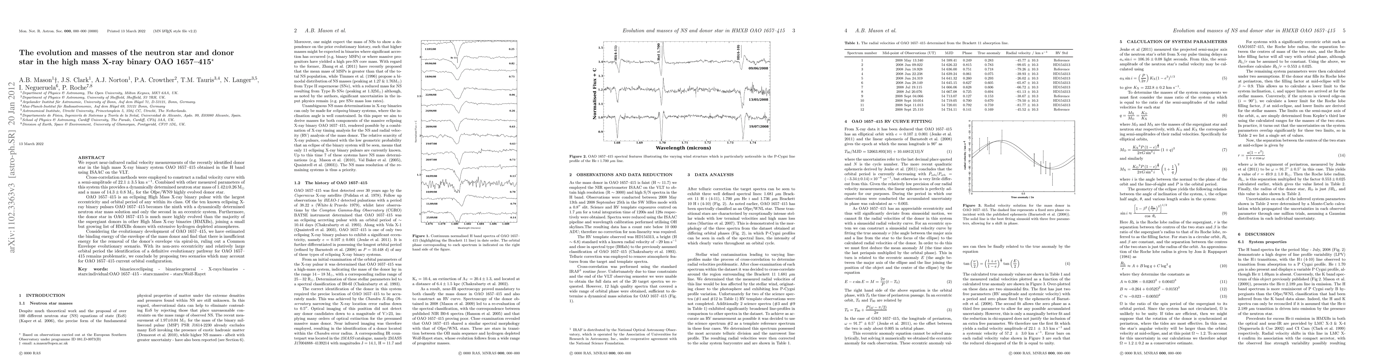We report near-infrared radial velocity measurements of the recently identified donor star in the high mass X-ray binary system OAO 1657-415 obtained in the H band using ISAAC on the VLT. Cross-correlation methods were employed to construct a radial velocity curve with a semi-amplitude of $22.1 \pm 3.5$ km s$^{-1}$. Combined with other measured parameters of this system this provides a dynamically determined neutron star mass of $1.42 \pm 0.26 M$_{\odot}$ and a mass of $14.3 \pm 0.8 M$_{\odot}$ for the Ofpe/WN9 highly evolved donor star. OAO 1657-415 is an eclipsing High Mass X-ray binary pulsar with the largest eccentricity and orbital period of any within its class. Of the ten known eclipsing X-ray binary pulsars OAO 1657-415 becomes the ninth with a dynamically determined neutron star mass solution and only the second in an eccentric system. Furthermore, the donor star in OAO 1657-415 is much more highly evolved than the majority of the supergiant donors in other High Mass X-ray binaries (HMXBs), joining a small but growing list of HMXBs donors with extensive hydrogen depleted atmospheres. Considering the evolutionary development of OAO 1657-415, we have estimated the binding energy of the envelope of the mass donor and find that there is insufficient energy for the removal of the donor's envelope via spiral-in, ruling out a Common Envelope evolutionary scenario. With its non-zero eccentricity and relatively large orbital period the identification of a definitive evolutionary pathway for OAO1657-415 remains problematic, we conclude by proposing two scenarios which may account for OAO1657-415 current orbital configuration.