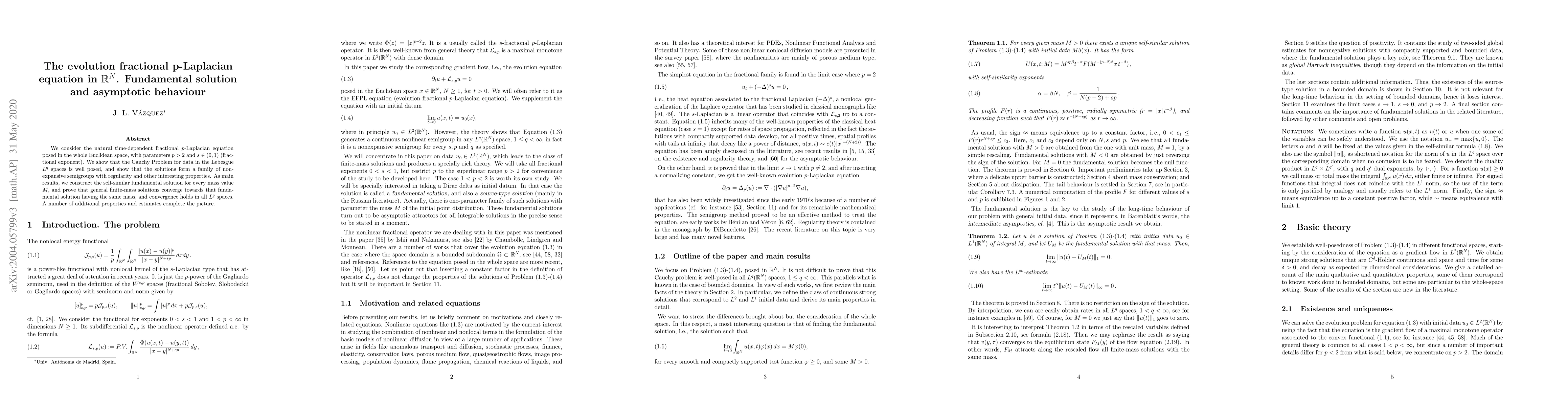 This paper studies the evolution fractional p-Laplacian equation in $\mathbb{R}^N$, proving well-posedness for data in $L^q$ spaces and constructing a self-similar fundamental solution. It demonstrates that finite-mass solutions converge to this fundamental solution in all $L^q$ spaces.