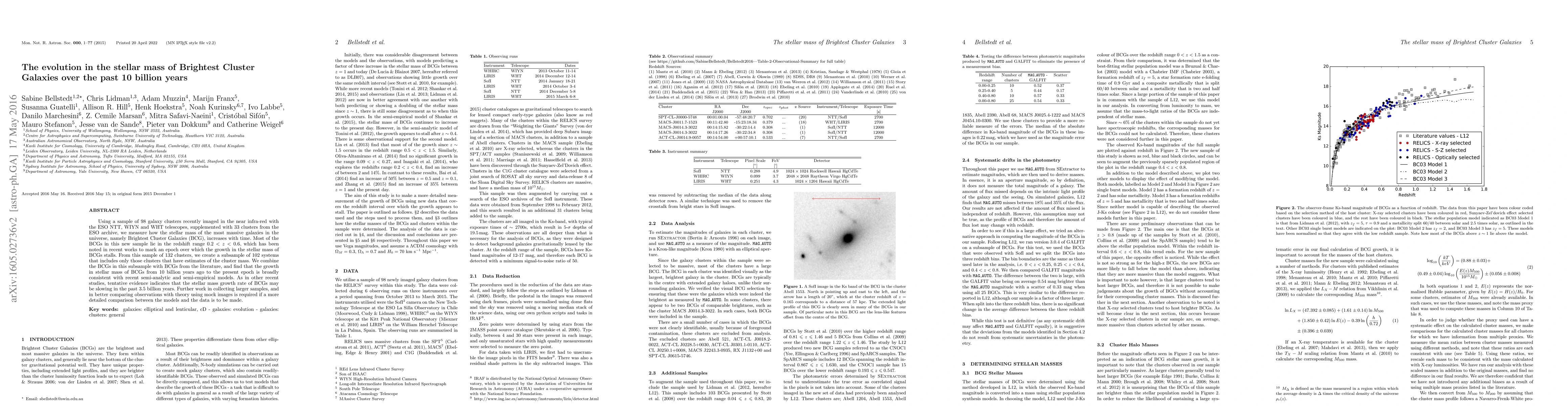 The research utilized a sample of 132 galaxy clusters, supplemented with 33 from the ESO archive, imaged in the near-infrared with various telescopes. The study combined BCGs from this sample with literature data, focusing on clusters with mass estimates to examine the stellar mass growth of Brightest Cluster Galaxies (BCGs) over the past 10 billion years.