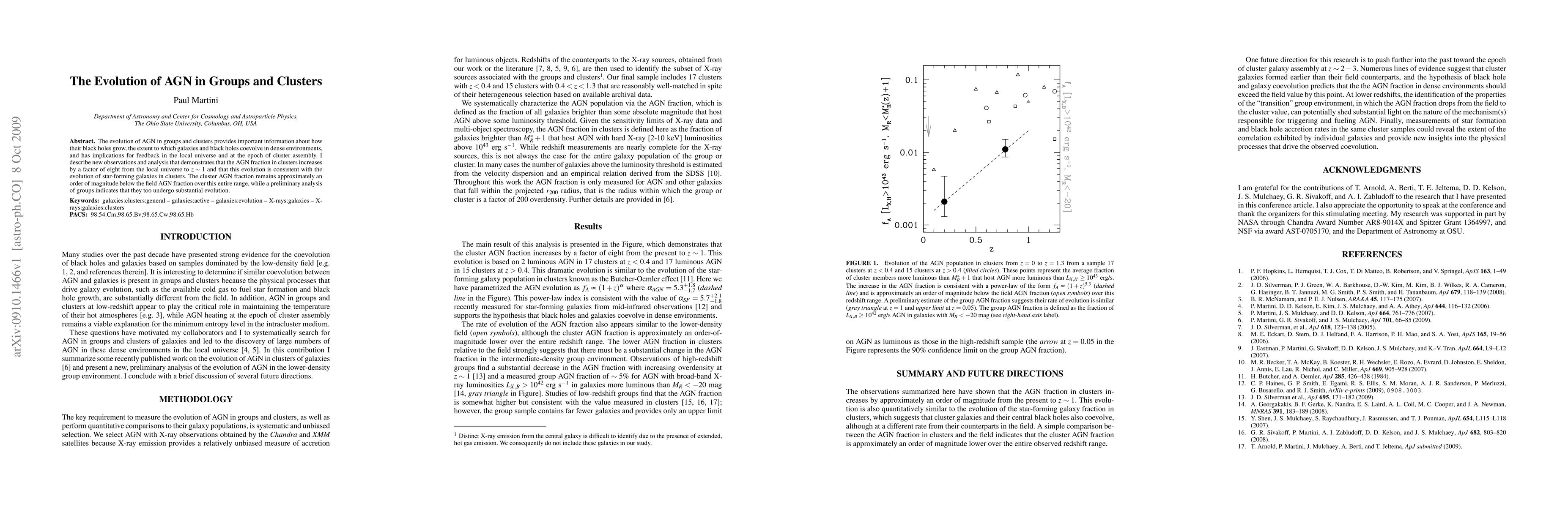 This paper investigates the evolution of active galactic nuclei (AGN) in groups and clusters, showing that the AGN fraction in clusters increases significantly from the local universe to z~1. The study finds that this evolution parallels that of star-forming galaxies in clusters and suggests a substantial evolution in AGN fractions in groups as well.
