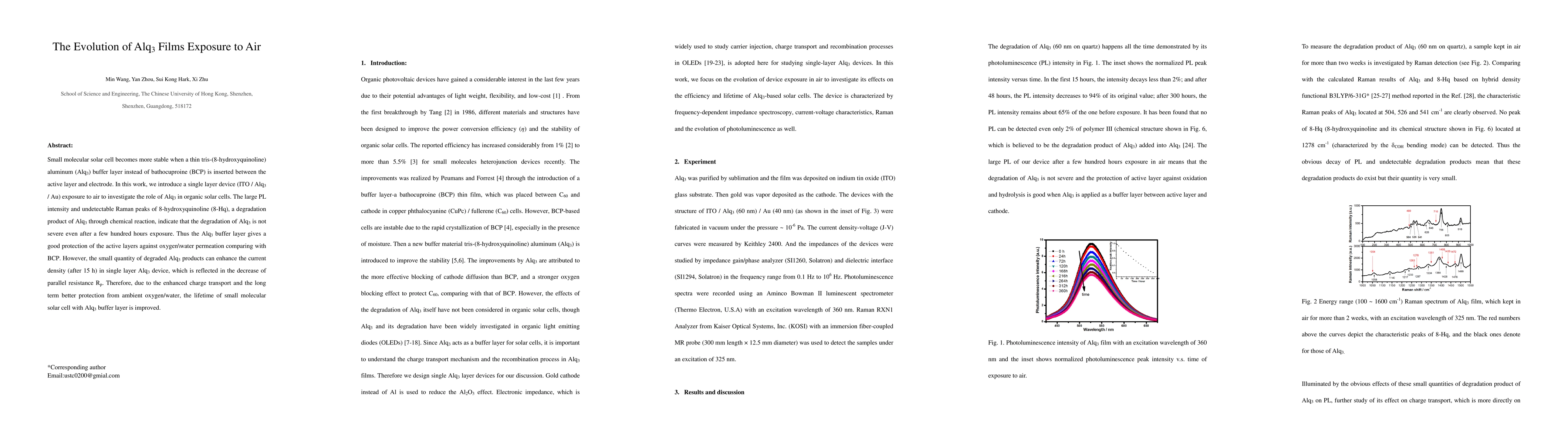 Small molecular solar cell becomes more stable when a thin tris-(8-hydroxyquinoline) aluminum (Alq3) buffer layer instead of bathocuproine (BCP) is inserted between the active layer and electrode. In this work, we introduce a single layer device (ITO / Alq3 / Au) exposure to air to investigate the role of Alq3 in organic solar cells. The large PL intensity and undetectable Raman peaks of 8-hydroxyquinoline (8-Hq), a degradation product of Alq3 through chemical reaction, indicate that the degradation of Alq3 is not severe even after a few hundred hours exposure. Thus the Alq3 buffer layer gives a good protection of the active layers against oxygen\water permeation comparing with BCP. However, the small quantity of degraded Alq3 products can enhance the current density (after 15 h) in single layer Alq3 device, which is reflected in the decrease of parallel resistance Rp. Therefore, due to the enhanced charge transport and the long term better protection from ambient oxygen/water, the lifetime of small molecular solar cell with Alq3 buffer layer is improved.