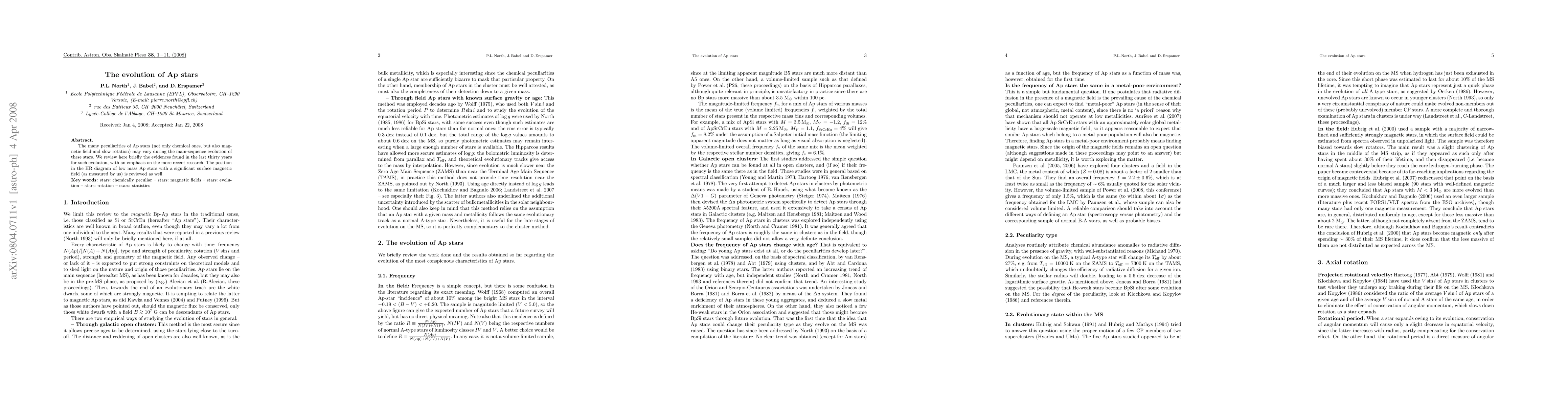 This paper reviews the evolution of Ap stars, focusing on changes in their chemical composition, magnetic fields, and rotation during their main-sequence phase. It highlights recent findings and the positions of low-mass Ap stars with significant magnetic fields in the HR diagram.