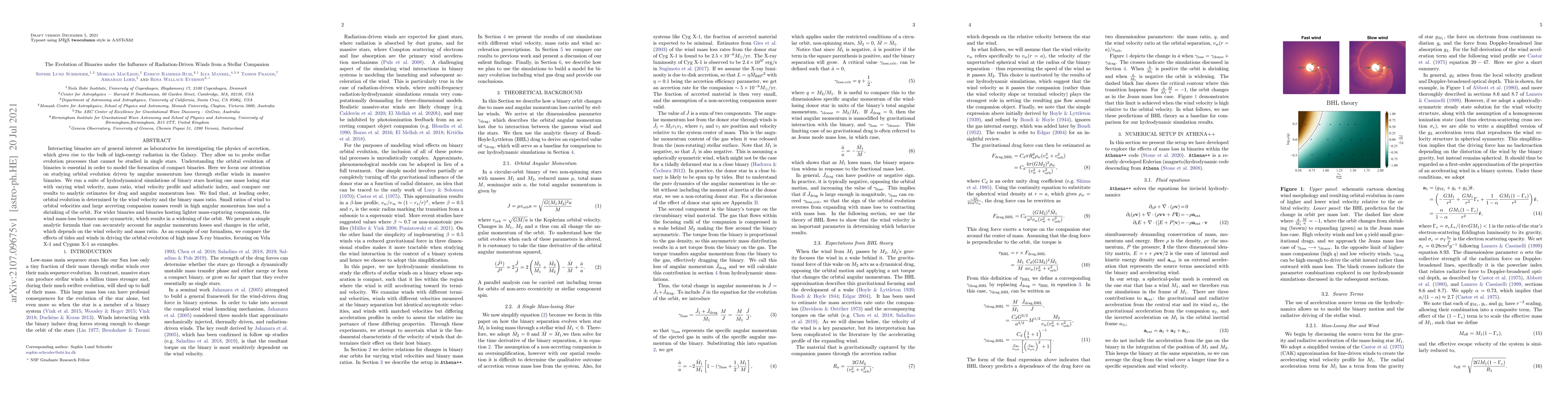 This paper investigates the orbital evolution of massive binary stars driven by radiation-induced stellar winds from one companion, finding that wind velocity and mass ratio are key factors. It presents a formula for angular momentum loss and orbit changes, and applies this to high-mass X-ray binaries like Vela X-1 and Cygnus X-1.