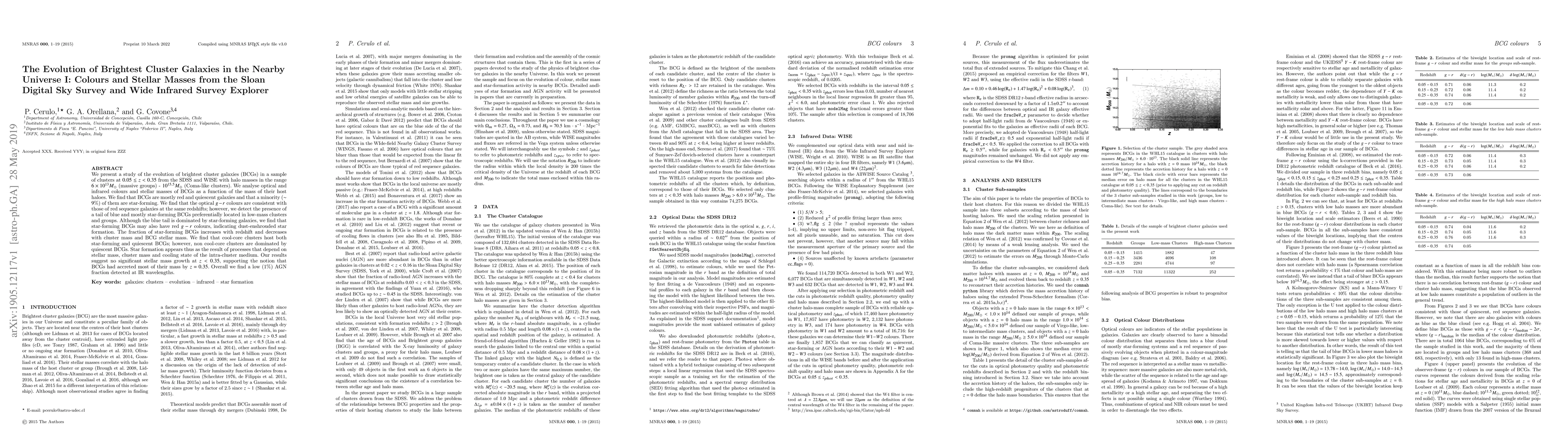 We present a study of the evolution of brightest cluster galaxies (BCGs) in a sample of clusters at $0.05 \leq z<0.35$ from the SDSS and WISE with halo masses in the range $6 \times 10^{13}M_\odot$ (massive groups) - $10^{15.5}M_\odot$ (Coma-like clusters). We analyse optical and infrared colours and stellar masses of BCGs as a function of the mass of their host haloes. We find that BCGs are mostly red and quiescent galaxies and that a minority ($\sim 9$\%) of them are star-forming. We find that the optical $g-r$ colours are consistent with those of red sequence galaxies at the same redshifts; however, we detect the presence of a tail of blue and mostly star-forming BCGs preferentially located in low-mass clusters and groups. Although the blue tail is dominated by star-forming galaxies, we find that star-forming BCGs may also have red $g-r$ colours, indicating dust-enshrouded star formation. The fraction of star-forming BCGs increases with redshift and decreases with cluster mass and BCG stellar mass. We find that cool-core clusters host both star-forming and quiescent BCGs; however, non cool-core clusters are dominated by quiescent BCGs. Star formation appears thus as the result of processes that depend on stellar mass, cluster mass and cooling state of the intra-cluster medium. Our results suggest no significant stellar mass growth at $z<0.35$, supporting the notion that BCGs had accreted most of their mass by $z = 0.35$. Overall we find a low (1\%) AGN fraction detected at IR wavelengths.