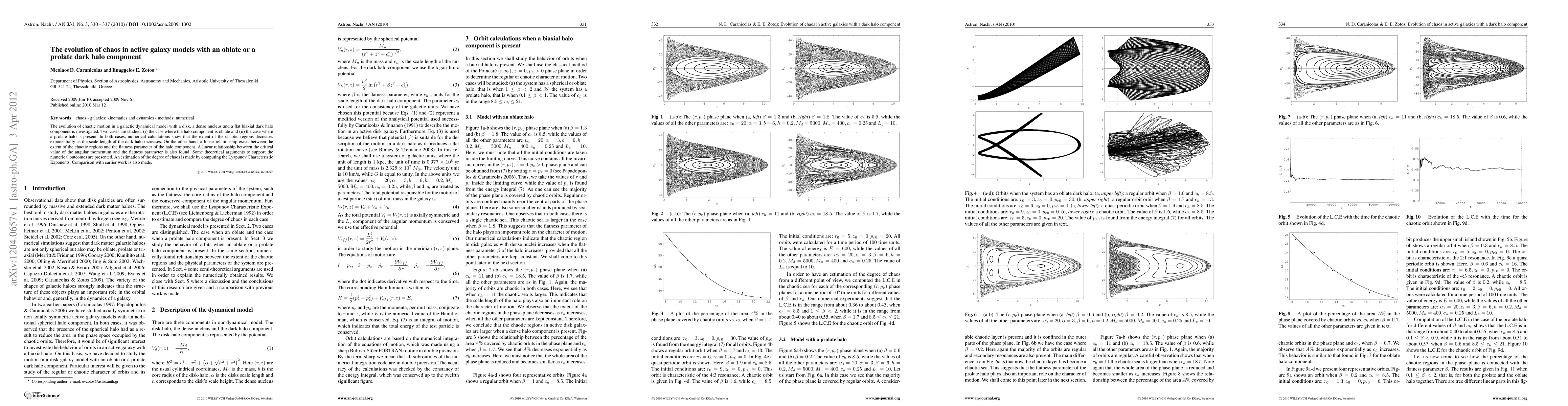 This paper investigates chaotic motion in galactic dynamical models with either an oblate or prolate dark halo, finding that chaos decreases with larger halo scale-lengths. It establishes linear relationships between chaotic region extent and halo flatness, as well as between angular momentum and halo flatness, supported by Lyapunov Characteristic Exponents.