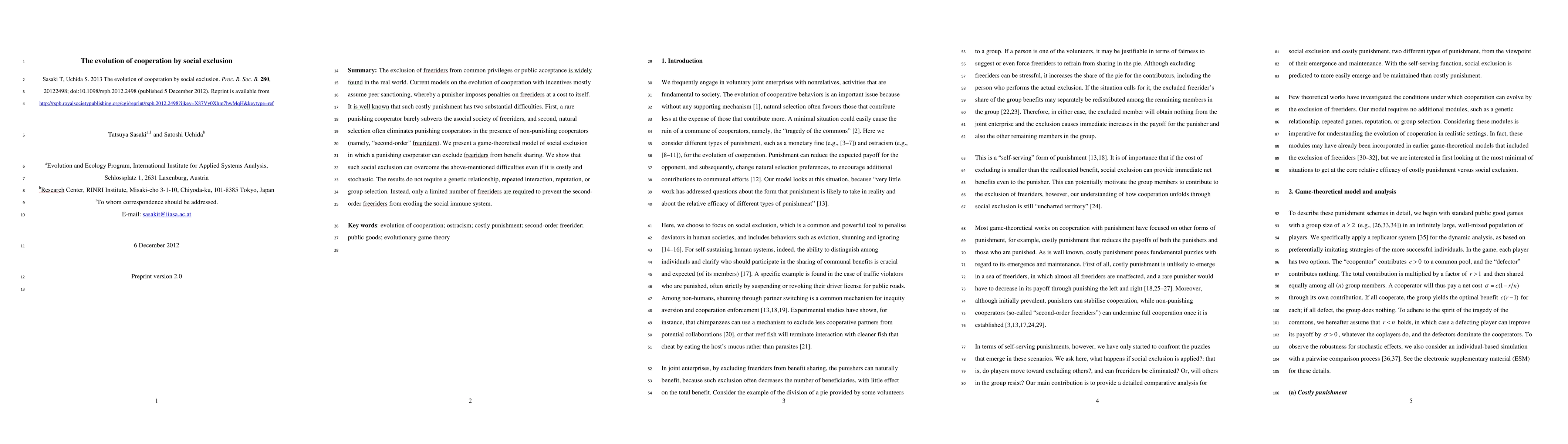 The exclusion of freeriders from common privileges or public acceptance is widely found in the real world. Current models on the evolution of cooperation with incentives mostly assume peer sanctioning, whereby a punisher imposes penalties on freeriders at a cost to itself. It is well known that such costly punishment has two substantial difficulties. First, a rare punishing cooperator barely subverts the asocial society of freeriders, and second, natural selection often eliminates punishing cooperators in the presence of non-punishing cooperators (namely, "second-order" freeriders). We present a game-theoretical model of social exclusion in which a punishing cooperator can exclude freeriders from benefit sharing. We show that such social exclusion can overcome the above-mentioned difficulties even if it is costly and stochastic. The results do not require a genetic relationship, repeated interaction, reputation, or group selection. Instead, only a limited number of freeriders are required to prevent the second-order freeriders from eroding the social immune system.