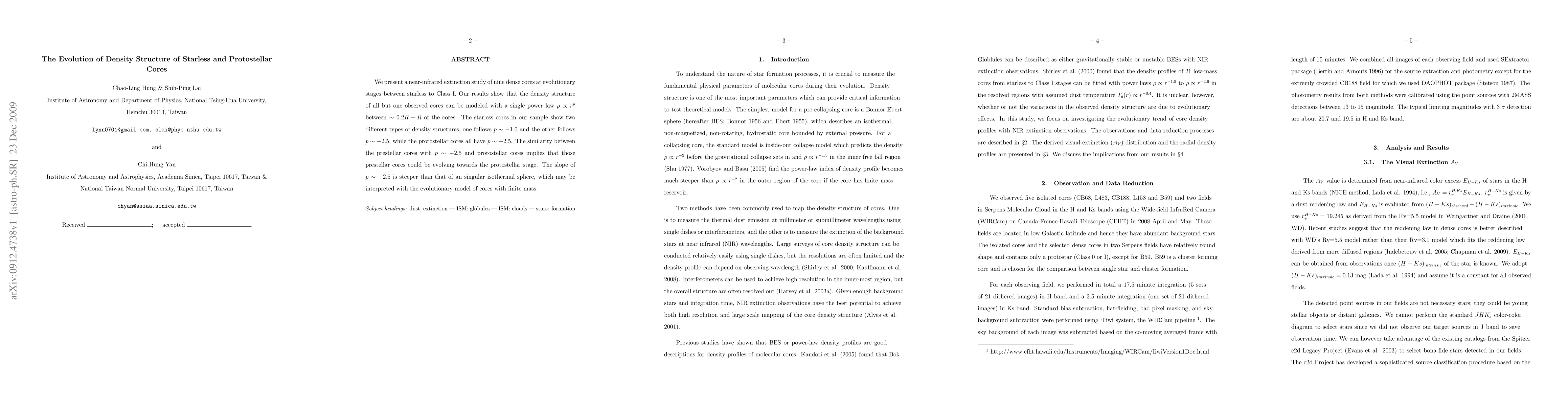 This study examines the density structure of nine dense cores in various evolutionary stages from starless to Class I, revealing that most follow a single power law density profile. The starless cores exhibit two distinct density structures, while protostellar cores uniformly show a steeper density profile, suggesting a transition towards protostellar evolution.