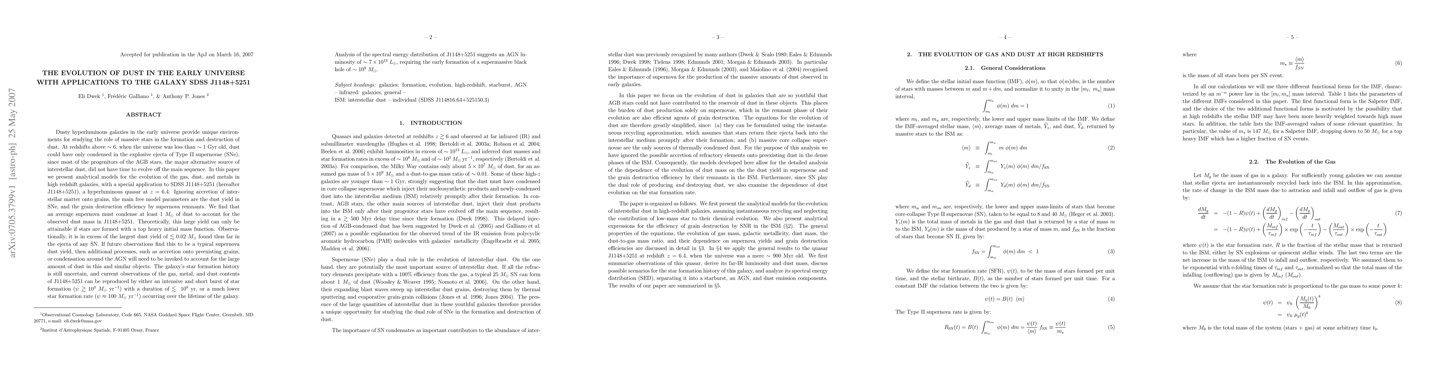 Dusty hyperluminous galaxies in the early universe provide unique environments for studying the role of massive stars in the formation and destruction of dust. At redshifts above ~ 6, when the universe was less than ~ 1 Gyr old, dust could have only condensed in the explosive ejecta of Type II supernovae (SNe), since most of the progenitors of the AGB stars, the major alternative source of interstellar dust, did not have time to evolve off the main sequence since the onset of star formation. In this paper we present analytical models for the evolution of the gas, dust, and metals in high redshift galaxies, with a special application to SDSS J1148+5251, a hyperluminous quasar at z = 6.4. We find that an average supernova must condense at least 1 Msun of dust to account for the observed dust mass in this quasar. Observationally, it is in excess of the largest dust yield of ~0.02 Msun found thus far in the ejecta of any SN. If future observations find this to be a typical supernova dust yield, then additional processes, such as accretion onto preexisting grains, or condensation around the AGN will need to be invoked to account for the large amount of dust in this and similar objects. The galaxy's star formation history is still uncertain, and current observations of the gas, metal, and dust contents of J1148 can be reproduced by either an intensive and short burst of star formation (~ 1000 Msun/yr) with a duration of ~ 100 Myr, or a much lower star formation rate (~ 100 Msun/yr) occurring over the lifetime of the galaxy.