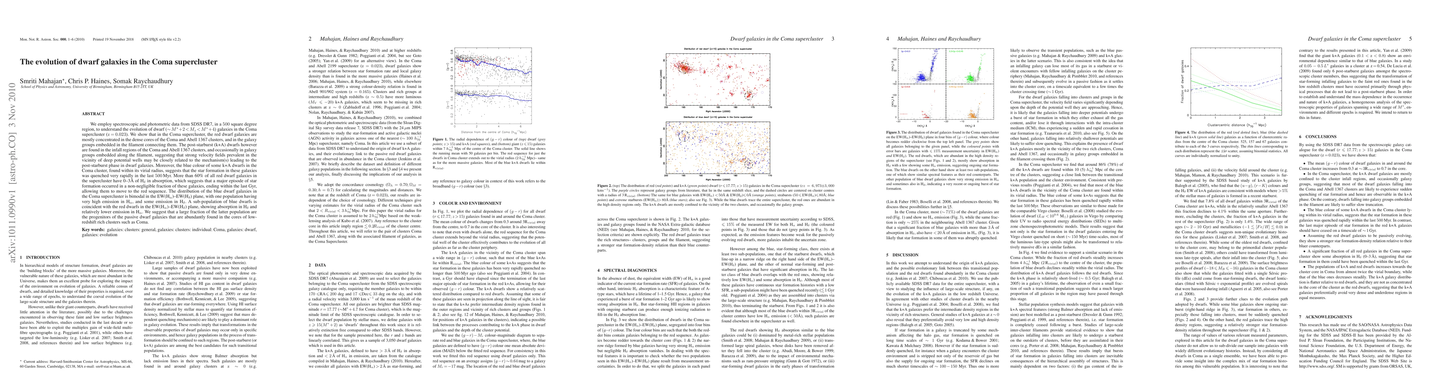 This paper uses SDSS DR7 data to study the evolution of dwarf galaxies in the Coma supercluster, finding that red dwarfs are concentrated in dense core regions, while post-starburst dwarfs are located in infall regions, suggesting star formation quenching is linked to strong velocity fields. The study also reveals a bimodal distribution of blue dwarf galaxies, indicating different evolutionary paths for these galaxies.