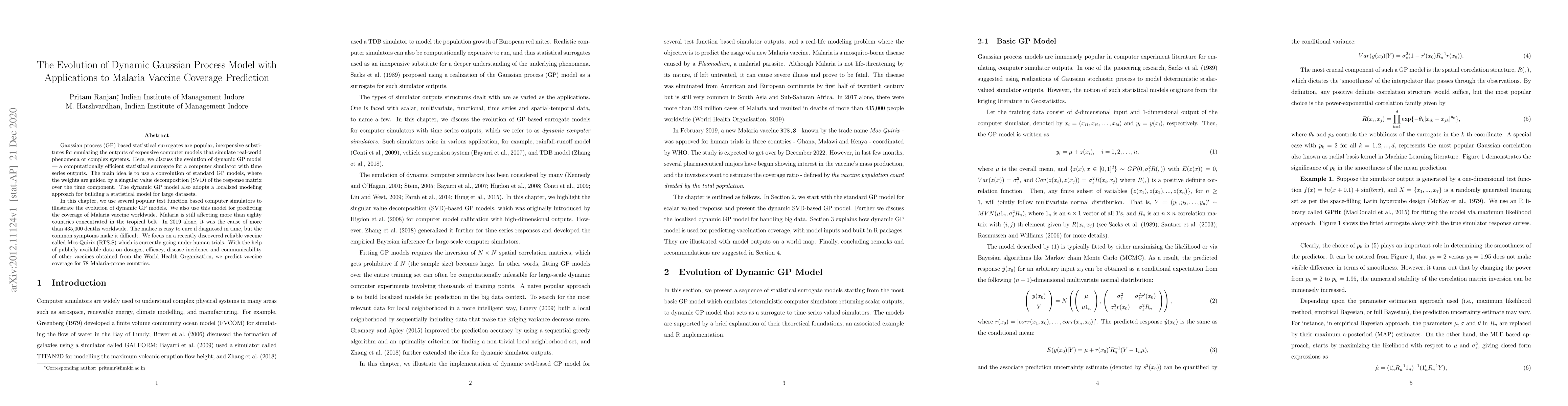 Gaussian process (GP) based statistical surrogates are popular, inexpensive substitutes for emulating the outputs of expensive computer models that simulate real-world phenomena or complex systems. Here, we discuss the evolution of dynamic GP model - a computationally efficient statistical surrogate for a computer simulator with time series outputs. The main idea is to use a convolution of standard GP models, where the weights are guided by a singular value decomposition (SVD) of the response matrix over the time component. The dynamic GP model also adopts a localized modeling approach for building a statistical model for large datasets. In this chapter, we use several popular test function based computer simulators to illustrate the evolution of dynamic GP models. We also use this model for predicting the coverage of Malaria vaccine worldwide. Malaria is still affecting more than eighty countries concentrated in the tropical belt. In 2019 alone, it was the cause of more than 435,000 deaths worldwide. The malice is easy to cure if diagnosed in time, but the common symptoms make it difficult. We focus on a recently discovered reliable vaccine called Mos-Quirix (RTS,S) which is currently going under human trials. With the help of publicly available data on dosages, efficacy, disease incidence and communicability of other vaccines obtained from the World Health Organisation, we predict vaccine coverage for 78 Malaria-prone countries.