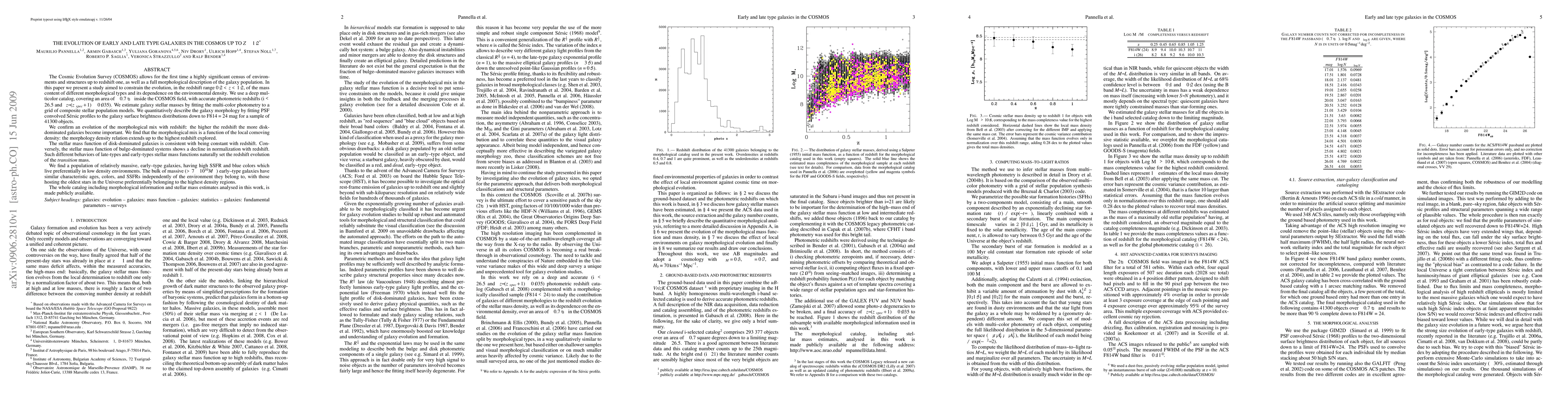 This paper investigates the evolution of early and late-type galaxies in the COSMOS survey up to redshift z~1.2, finding that disk-dominated galaxies become more prevalent at higher redshifts. It reveals a morphology density relation extending to the highest redshifts studied, with disk-dominated galaxies maintaining constant stellar mass functions while bulge-dominated galaxies show a decline.